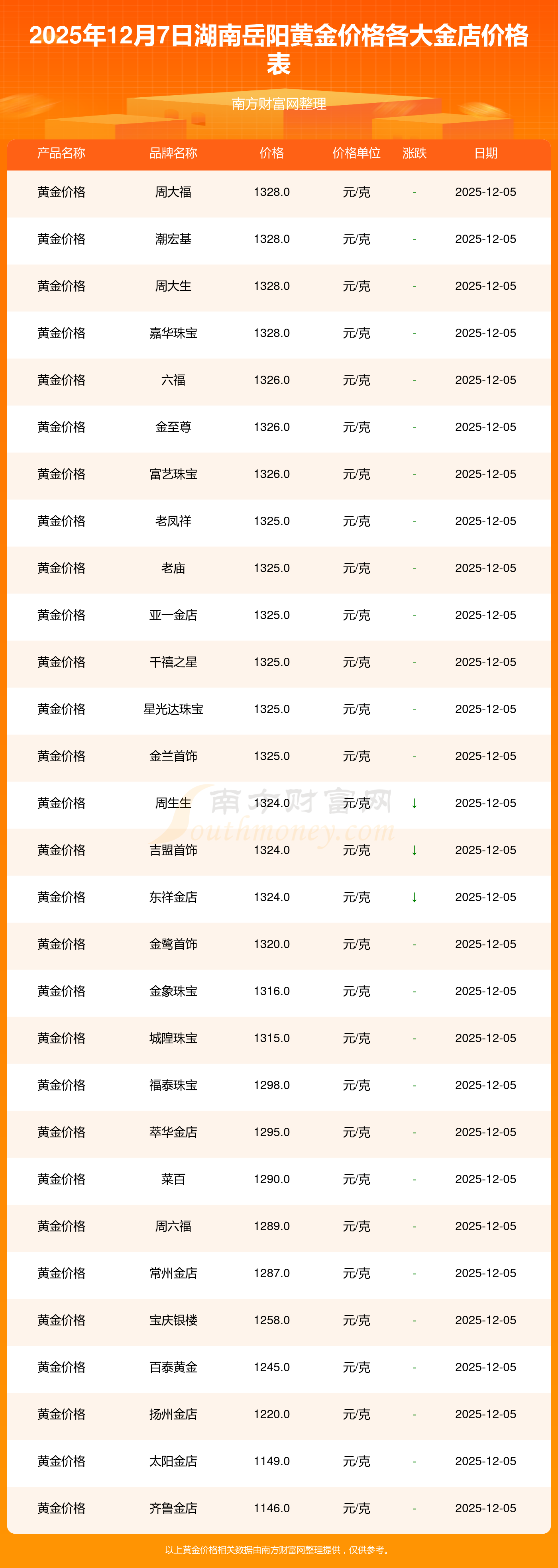 2025年12月7日湖南岳阳周大福、周大福、周大福、周大福、周大福、周大福、周大福、老凤祥、老凤祥、老凤祥、周六福等各大金店品牌黄金价格最新价格行情来了,如下:周大福黄金价格1328.0元/克,周大福铂金价格662.0元/克,周大福饰品金价(内地)1328.0元/克,周大福黄金饰品(香港)46550.0,周大福铂金价格(香港)18970.0,周大福金条价格(香港)41990.0,周大福金条金价(内地)1165.0元/克,老凤祥黄金价格1325.0元/克,老凤祥铂金价格600.0元/克,老凤祥足金价格1325.0元/克,周六福黄金价格1289.0元/克。