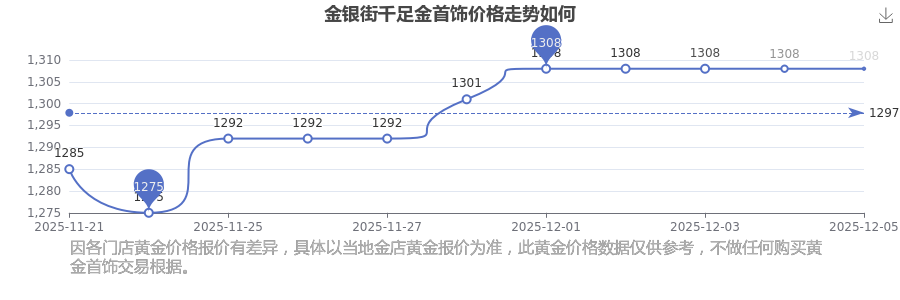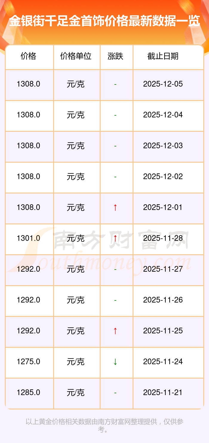 当下,金银街 千足金首饰今日的最新价格是1308.0元/克。