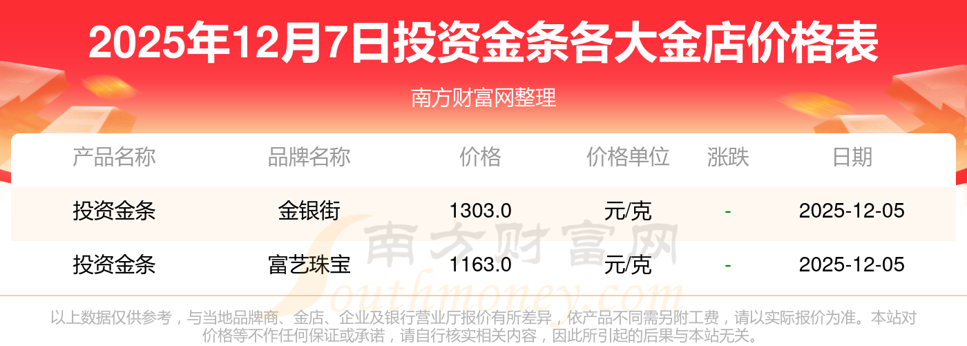 今天是2025年12月7日,周大福、周大福、周大福、周大福、周大福、周大福、周大福、老凤祥、老凤祥、老凤祥、周六福等各大金店品牌投资金条最新价格如下:周大福1328.0元/克、周大福662.0元/克、周大福1328.0元/克、周大福46550.0、周大福18970.0、周大福41990.0、周大福1165.0元/克、老凤祥1325.0元/克、老凤祥600.0元/克、老凤祥1325.0元/克、周六福1289.0元/克。