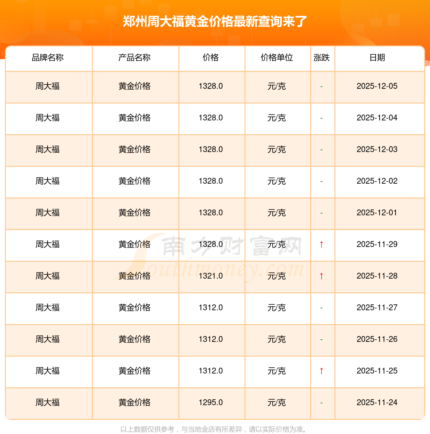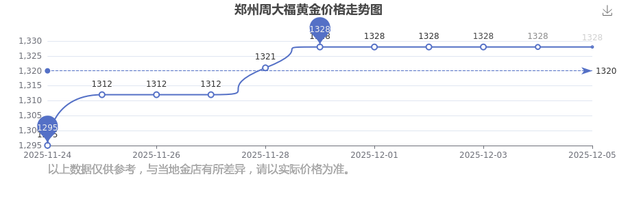 2025年12月7日郑州周大福黄金价格:1328.0元/克。