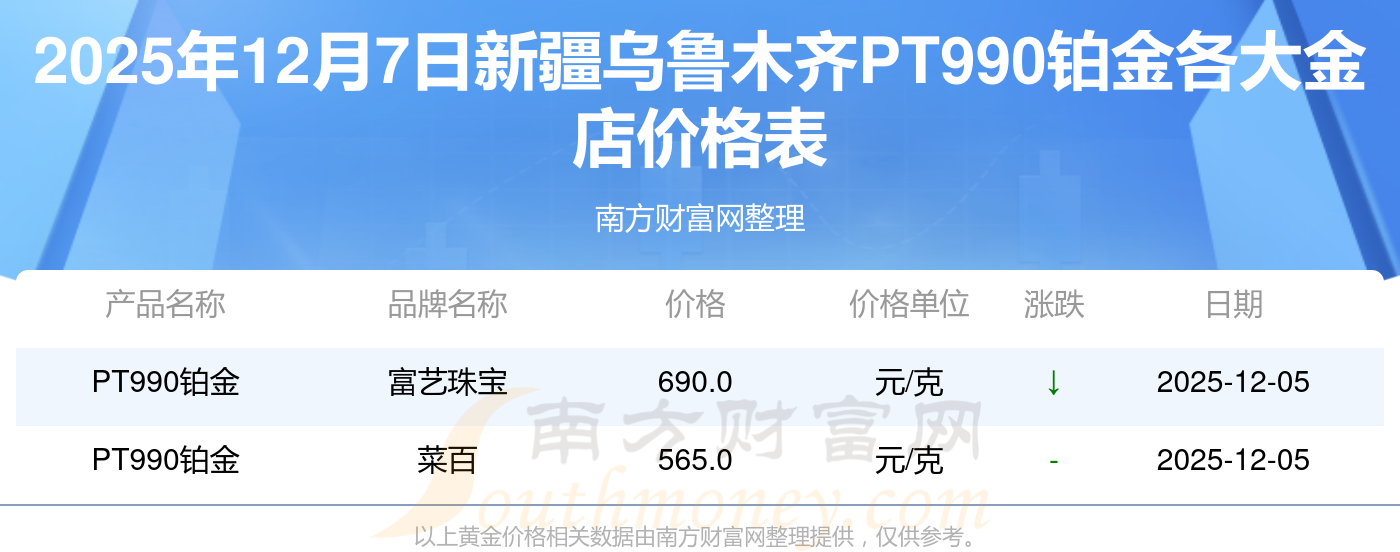 2025年12月7日,新疆乌鲁木齐周大福、周大福、周大福、周大福、周大福、周大福、周大福、老凤祥、老凤祥、老凤祥、周六福等各大金店品牌PT990铂金今日价格行情最新来了:周大福1328.0元/克、周大福662.0元/克、周大福1328.0元/克、周大福46550.0、周大福18970.0、周大福41990.0、周大福1165.0元/克、老凤祥1325.0元/克、老凤祥600.0元/克、老凤祥1325.0元/克、周六福1289.0元/克。