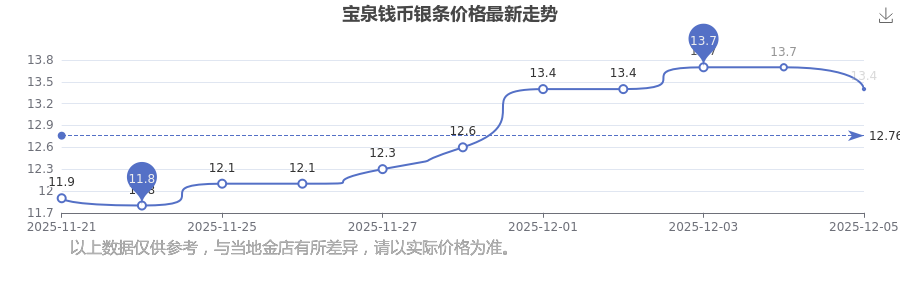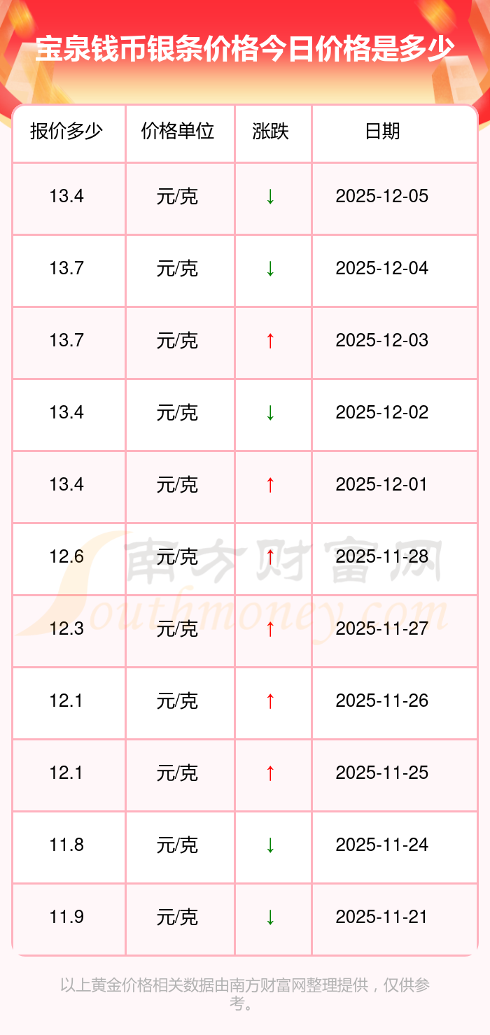 当下,宝泉钱币 银条价格今日的最新价格是13.4元/克。