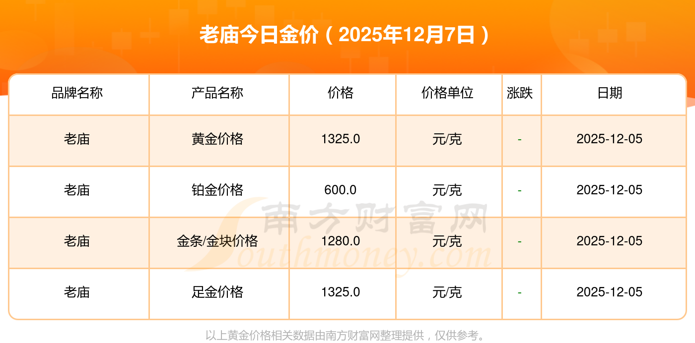 2025年12月7日各大金店铂金价格最新价格:周大福1328.0元/克,周大福662.0元/克,周大福1328.0元/克,周大福46550.0,周大福18970.0,周大福41990.0,周大福1165.0元/克,老凤祥1325.0元/克,老凤祥600.0元/克,老凤祥1325.0元/克,周六福1289.0元/克。