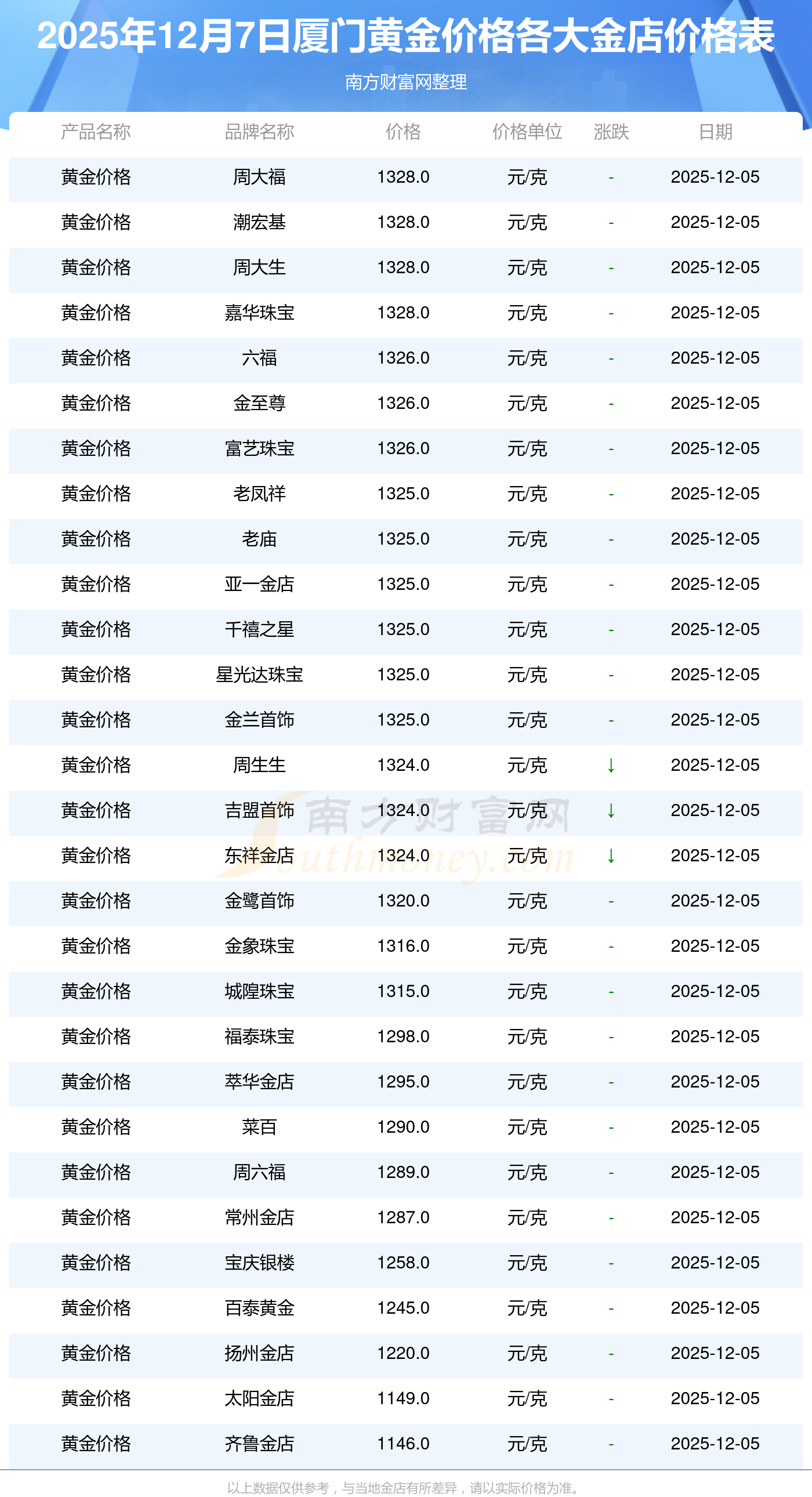 2025年12月7日厦门各大金店黄金价格最新价格:周大福1328.0元/克,周大福662.0元/克,周大福1328.0元/克,周大福46550.0,周大福18970.0,周大福41990.0,周大福1165.0元/克,老凤祥1325.0元/克,老凤祥600.0元/克,老凤祥1325.0元/克,周六福1289.0元/克。