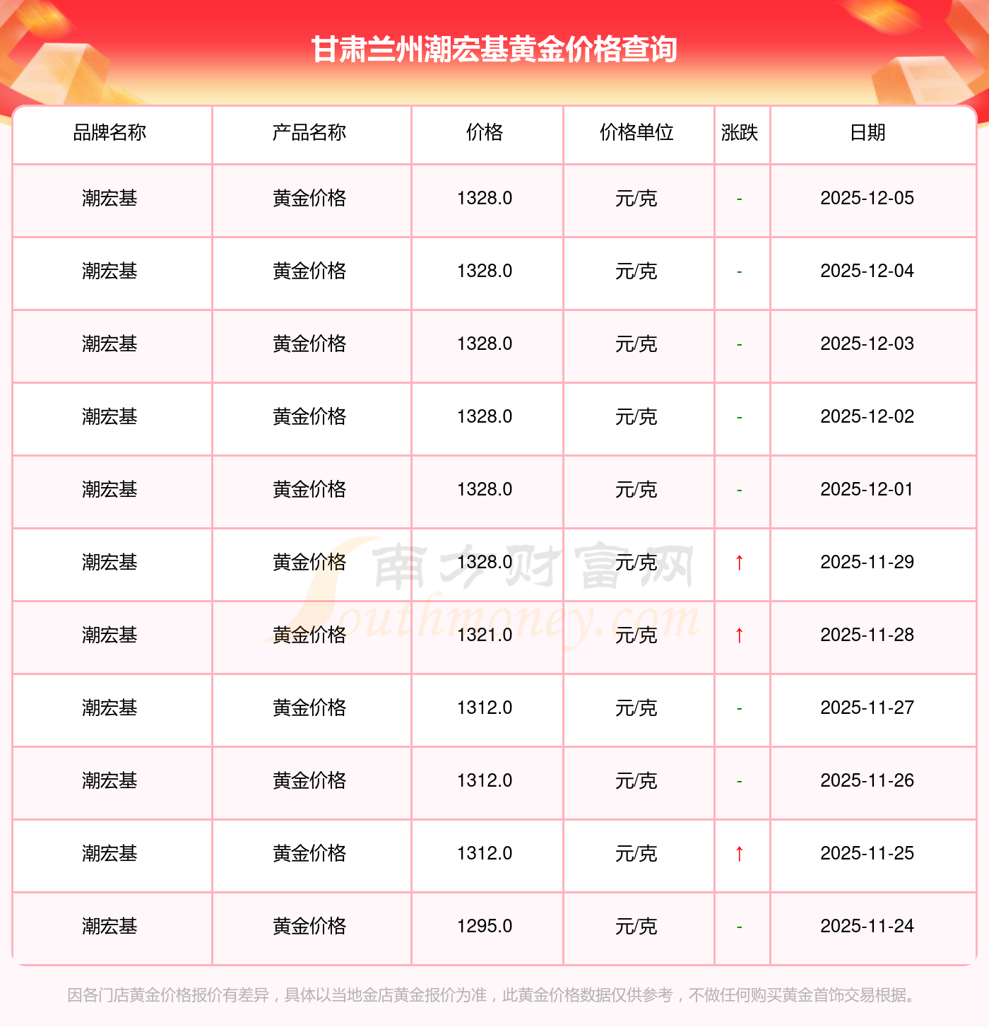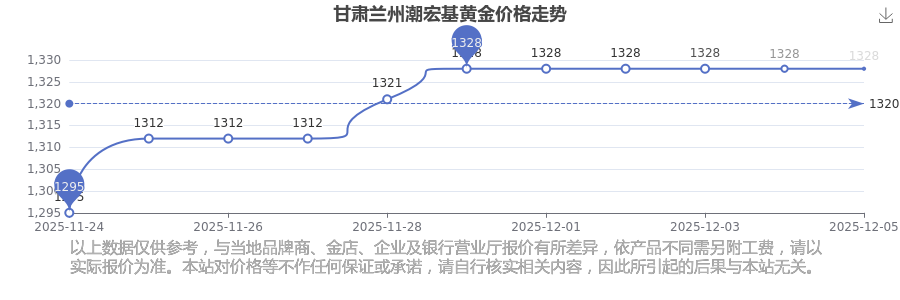 今日甘肃兰州潮宏基黄金价格最新为:1328.0元/克。