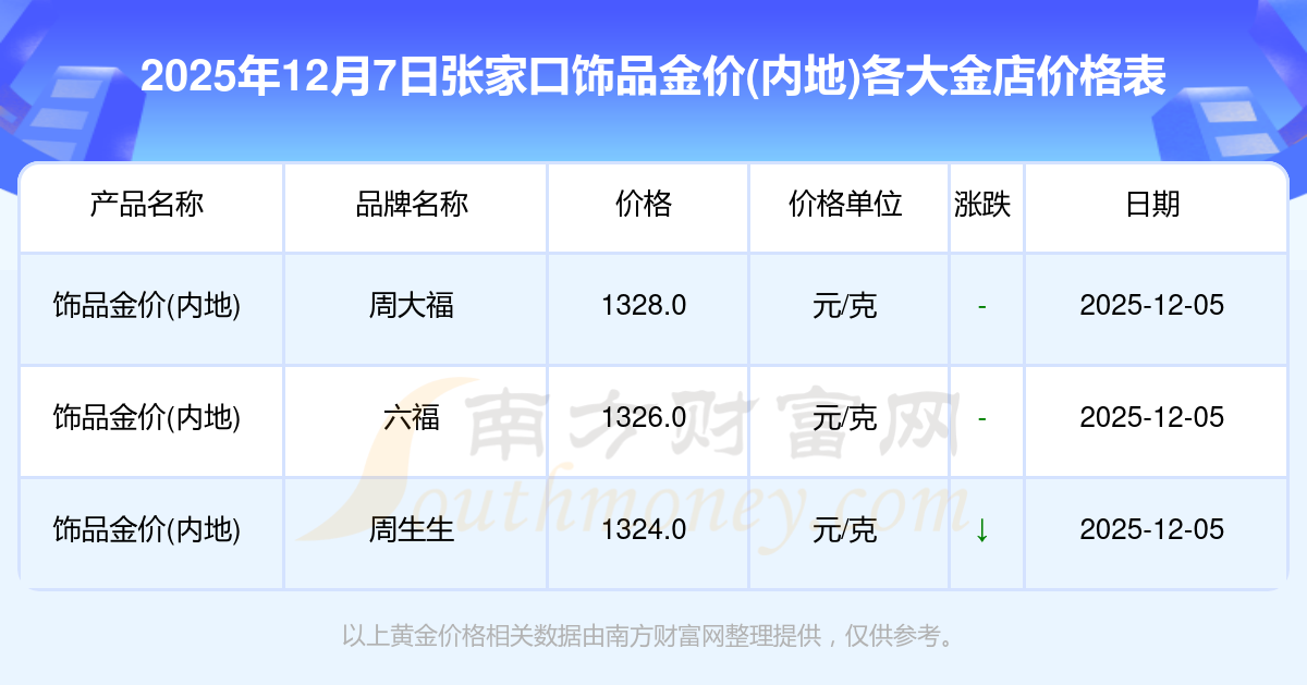 2025年12月7日,张家口周大福、周大福、周大福、周大福、周大福、周大福、周大福、老凤祥、老凤祥、老凤祥、周六福等各大金店品牌饰品金价(内地)今日价格如下:周大福1328.0元/克、周大福662.0元/克、周大福1328.0元/克、周大福46550.0、周大福18970.0、周大福41990.0、周大福1165.0元/克、老凤祥1325.0元/克、老凤祥600.0元/克、老凤祥1325.0元/克、周六福1289.0元/克。