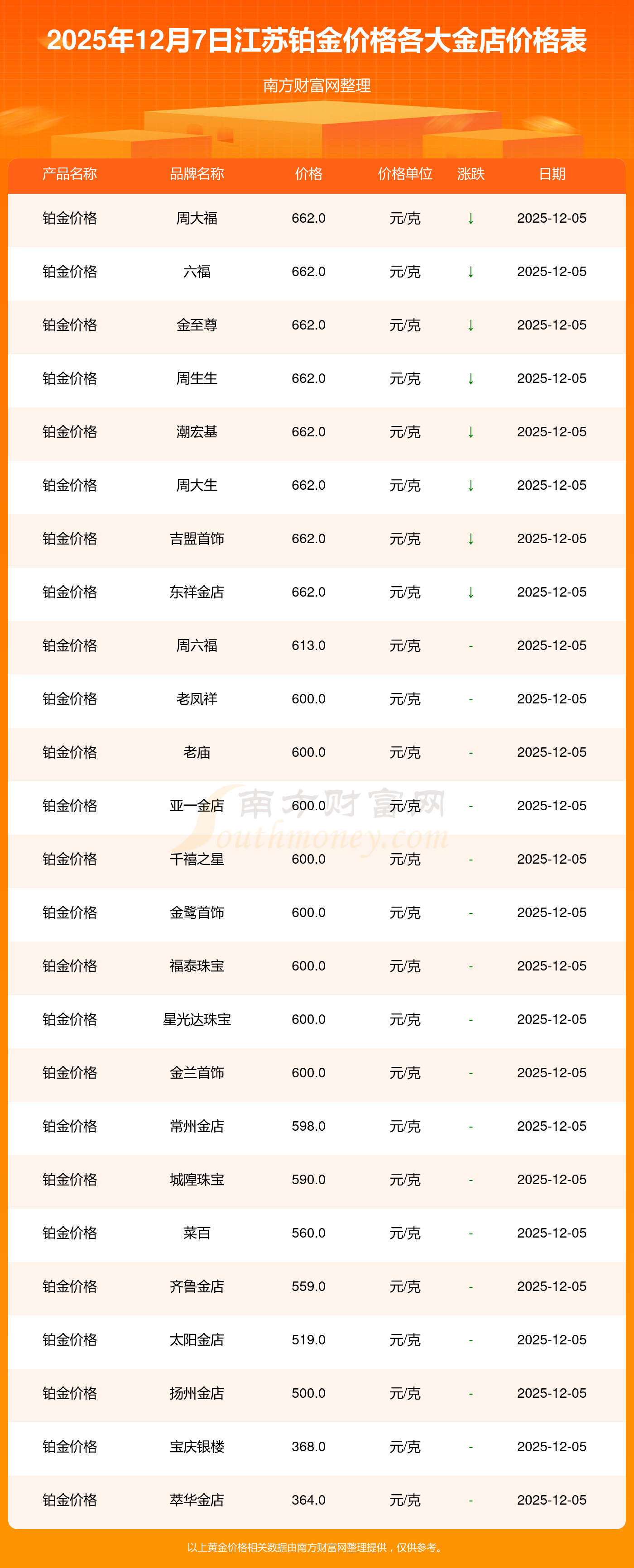 2025年12月7日江苏周大福、周大福、周大福、周大福、周大福、周大福、周大福、老凤祥、老凤祥、老凤祥、周六福等各大金店品牌铂金价格最新价格行情来了,如下:周大福黄金价格1328.0元/克,周大福铂金价格662.0元/克,周大福饰品金价(内地)1328.0元/克,周大福黄金饰品(香港)46550.0,周大福铂金价格(香港)18970.0,周大福金条价格(香港)41990.0,周大福金条金价(内地)1165.0元/克,老凤祥黄金价格1325.0元/克,老凤祥铂金价格600.0元/克,老凤祥足金价格1325.0元/克,周六福黄金价格1289.0元/克。