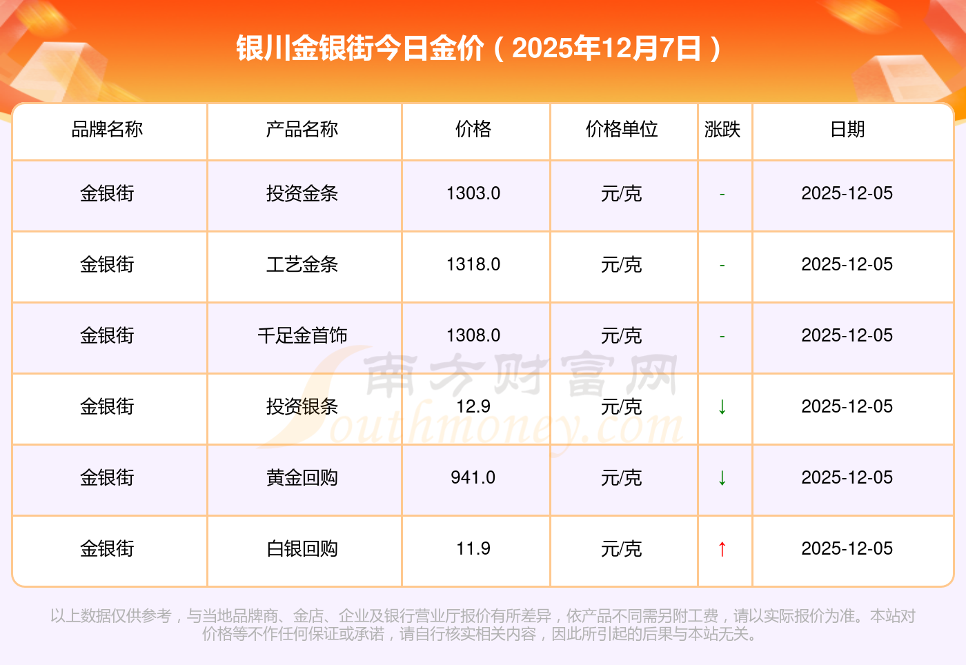 今日黄金价格查询_现在金价黄金一克多少钱,黄金价格是多少钱一克? 2025年12月7日银川金银街现在黄金一克要多少钱:黄金价格1328.0元/克,铂金价格662.0元/克,饰品金价(内地)1328.0元/克,黄金饰品(香港)46550.0,铂金价格(香港)18970.0,金条价格(香港)41990.0,金条金价(内地)1165.0元/克,黄金价格1325.0元/克,铂金价格600.0元/克,足金价格1325.0元/克,黄金价格1289.0元/克。