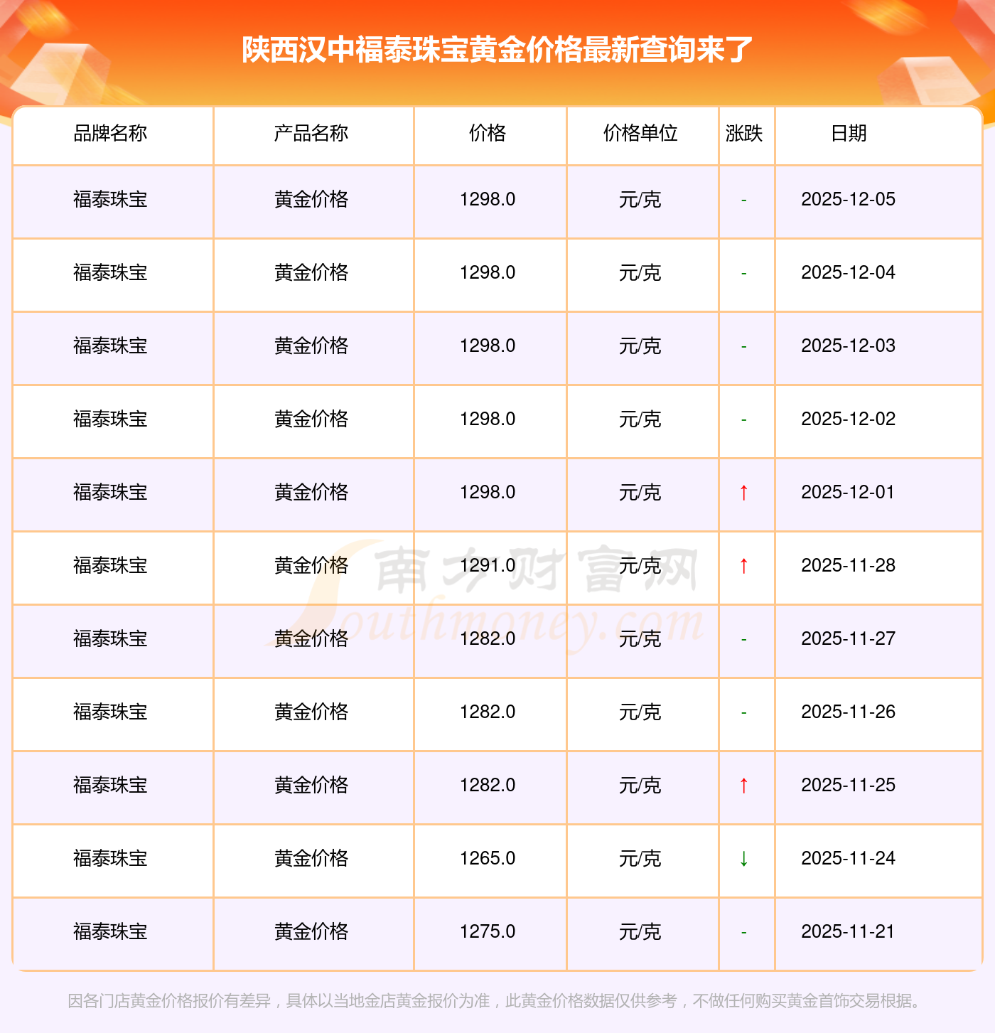 今日陕西汉中福泰珠宝黄金价格公布当下,今日的黄金一克卖多少钱2025年12月7日当天,陕西汉中福泰珠宝黄金价格的单价是 1298.0元/克。
