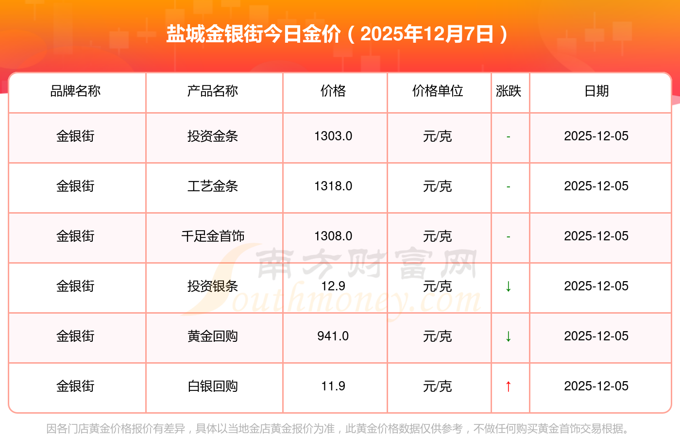 2025年12月7日盐城金银街金价查询:黄金价格1328.0元/克,铂金价格662.0元/克,饰品金价(内地)1328.0元/克,黄金饰品(香港)46550.0,铂金价格(香港)18970.0,金条价格(香港)41990.0,金条金价(内地)1165.0元/克,黄金价格1325.0元/克,铂金价格600.0元/克,足金价格1325.0元/克,黄金价格1289.0元/克。