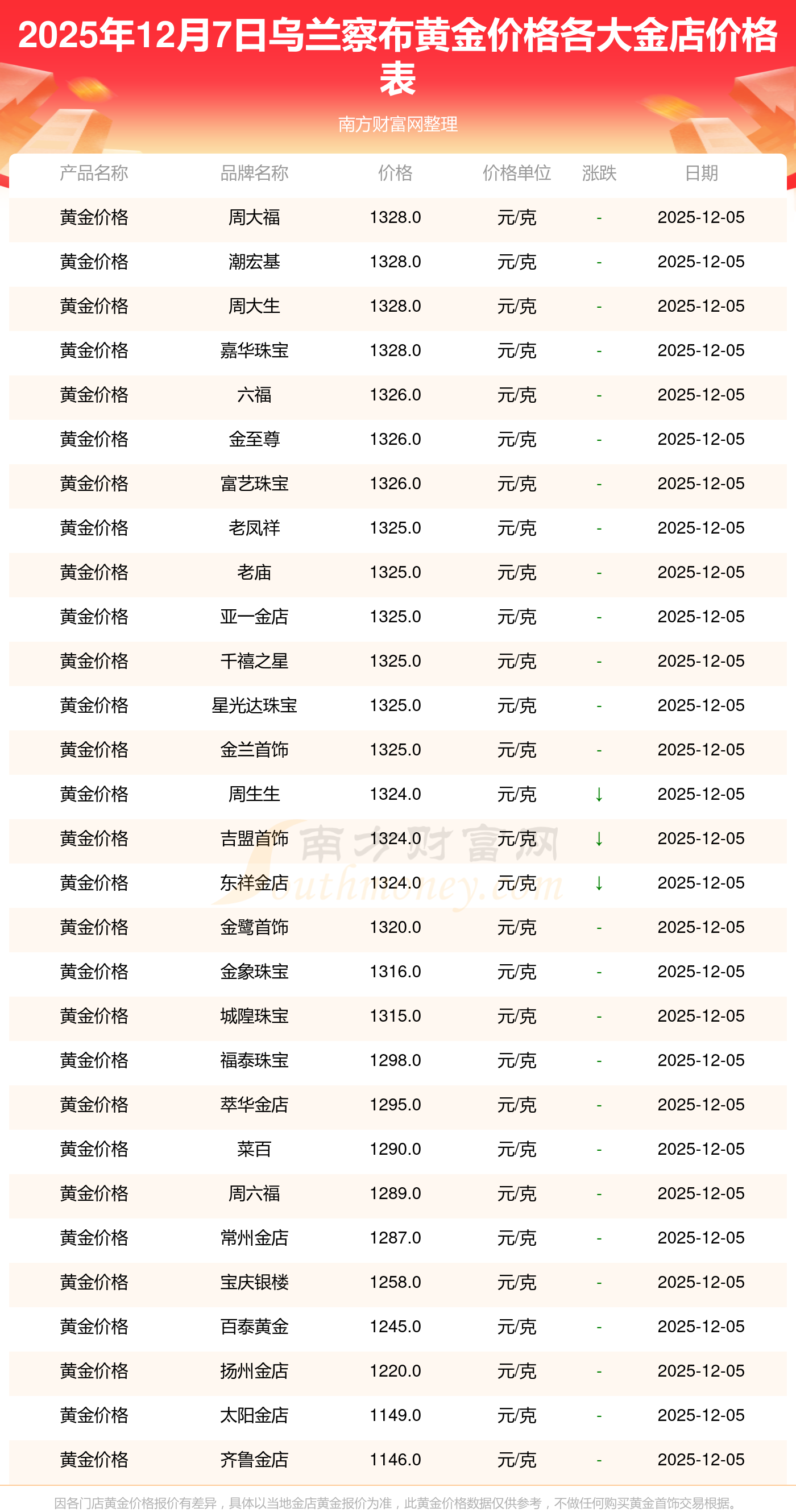 2025年12月7日,乌兰察布周大福、周大福、周大福、周大福、周大福、周大福、周大福、老凤祥、老凤祥、老凤祥、周六福等各大金店品牌黄金价格今日价格如下:周大福1328.0元/克、周大福662.0元/克、周大福1328.0元/克、周大福46550.0、周大福18970.0、周大福41990.0、周大福1165.0元/克、老凤祥1325.0元/克、老凤祥600.0元/克、老凤祥1325.0元/克、周六福1289.0元/克。
