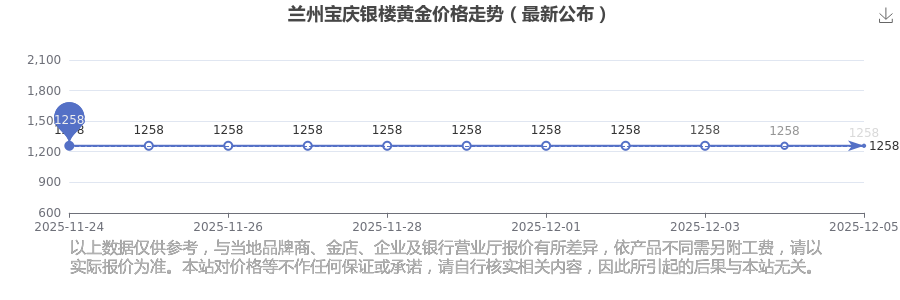 兰州宝庆银楼今日黄金价格每克多少钱,今天黄金一克在店铺里的售价是多少?今日兰州宝庆银楼黄金价格查询,今日(2025年12月7日)兰州宝庆银楼黄金价格是1258.0元/克。