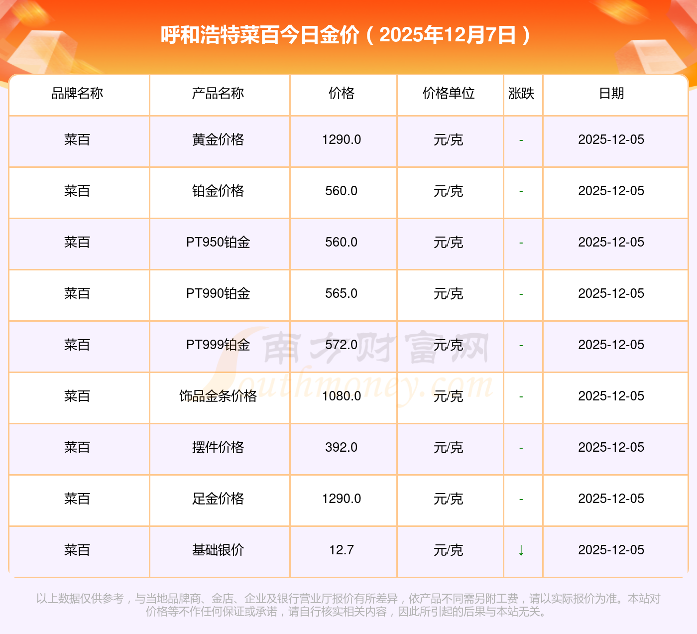 以上数据仅供参考,与当地品牌商、金店、企业及银行营业厅报价有所差异,依产品不同需另附工费,请以实际报价为准。本站对价格等不作任何保证或承诺,请自行核实相关内容,因此所引起的后果与本站无关。