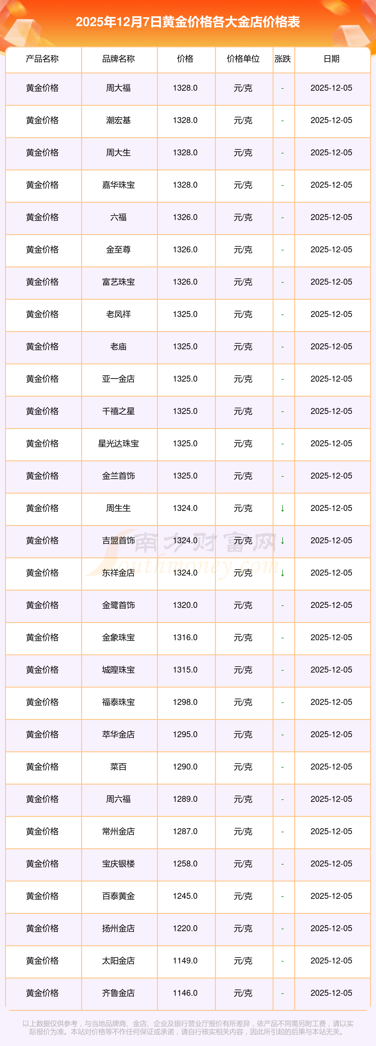 今天是2025年12月7日,周大福、周大福、周大福、周大福、周大福、周大福、周大福、老凤祥、老凤祥、老凤祥、周六福等各大金店品牌黄金价格最新价格如下:周大福1328.0元/克、周大福662.0元/克、周大福1328.0元/克、周大福46550.0、周大福18970.0、周大福41990.0、周大福1165.0元/克、老凤祥1325.0元/克、老凤祥600.0元/克、老凤祥1325.0元/克、周六福1289.0元/克。