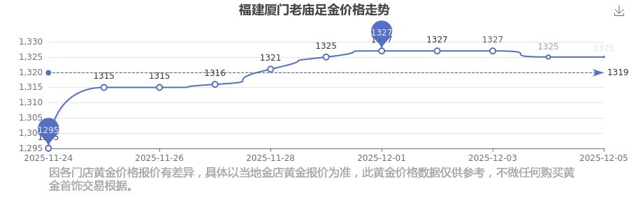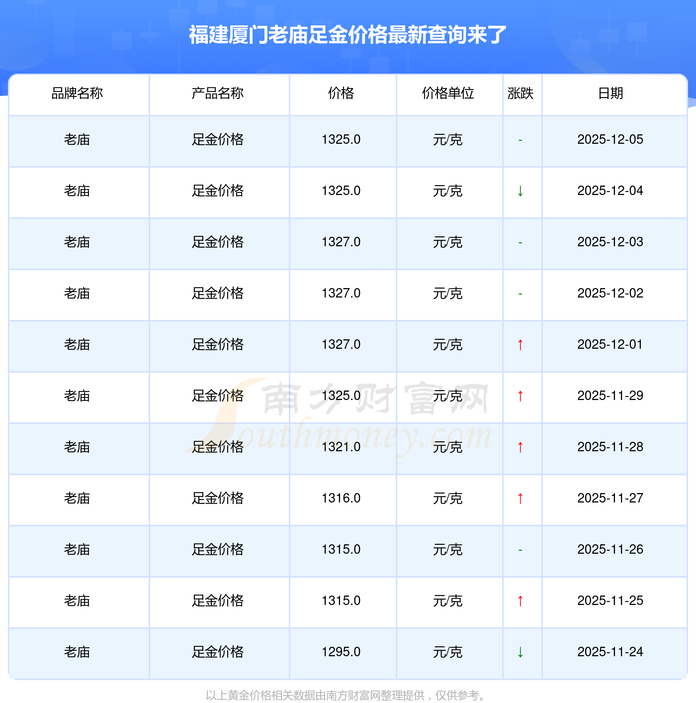 2025年12月7日,福建厦门老庙足金价格每克的售卖价位为1325.0元/克。