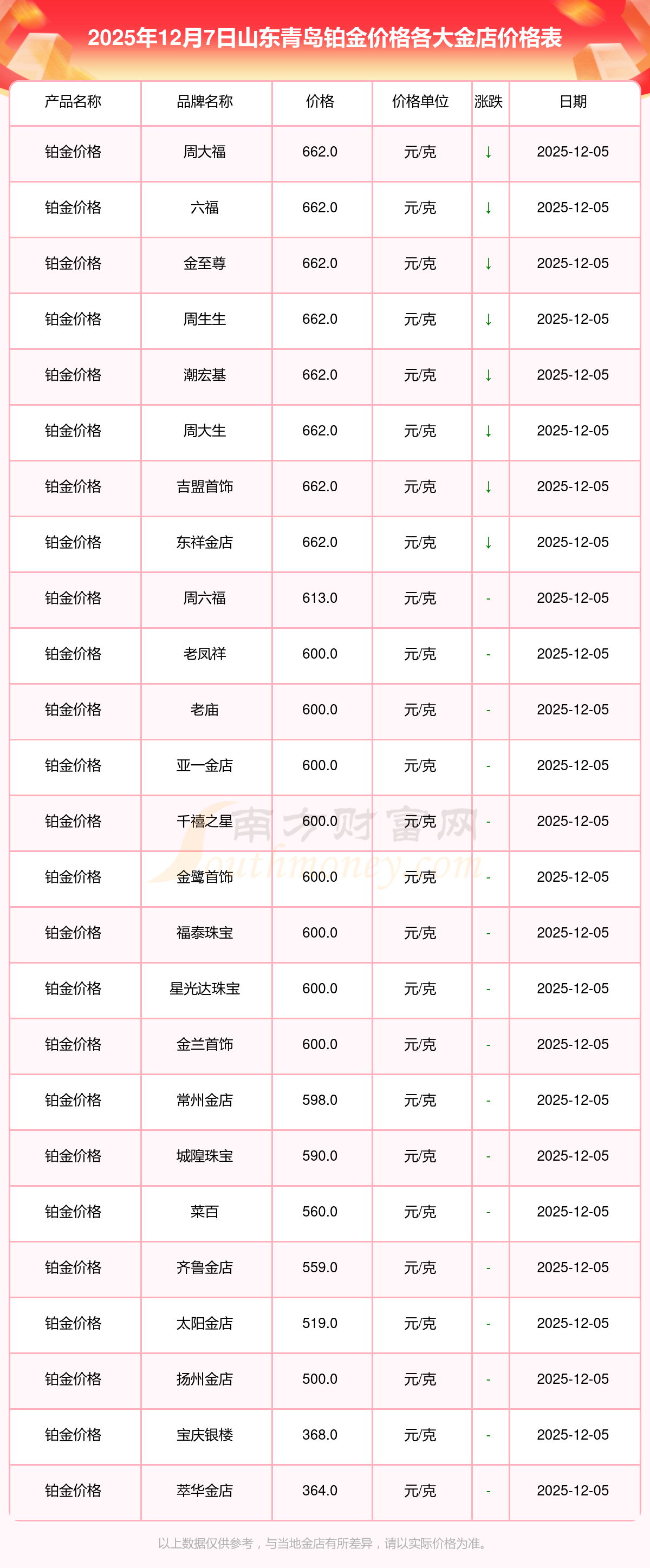 今天是2025年12月7日,山东青岛周大福、周大福、周大福、周大福、周大福、周大福、周大福、老凤祥、老凤祥、老凤祥、周六福等各大金店品牌铂金价格最新价格如下:周大福1328.0元/克、周大福662.0元/克、周大福1328.0元/克、周大福46550.0、周大福18970.0、周大福41990.0、周大福1165.0元/克、老凤祥1325.0元/克、老凤祥600.0元/克、老凤祥1325.0元/克、周六福1289.0元/克。