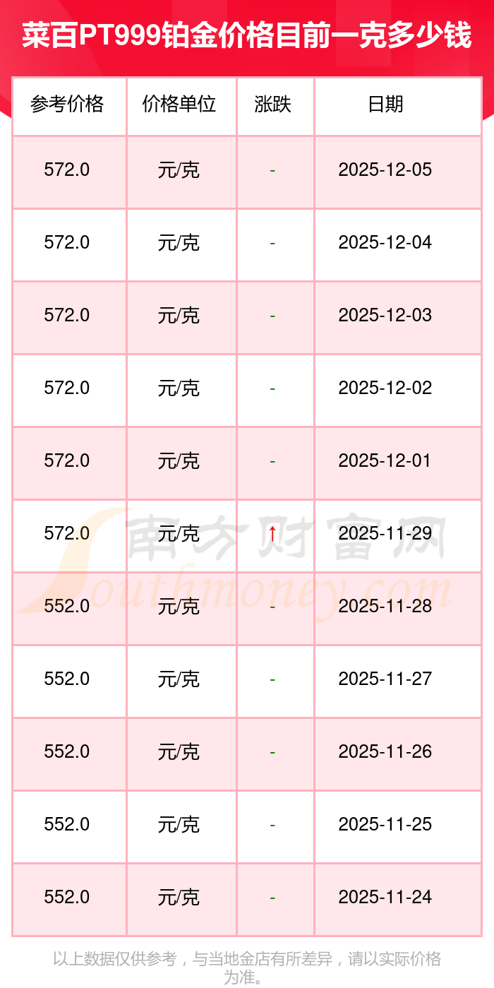 当下,菜百 PT999铂金今日的最新价格是572.0元/克。