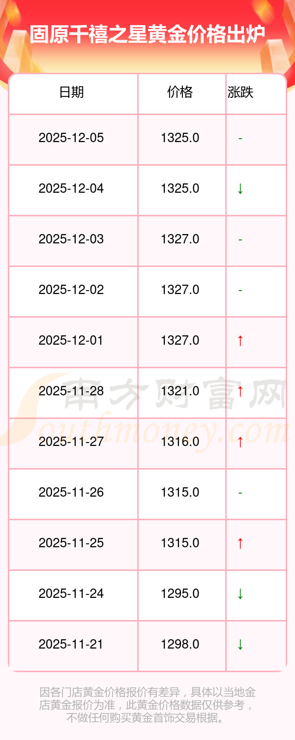 今日(2025年12月7日),1325.0元/克是固原千禧之星黄金价格的价格标准。
