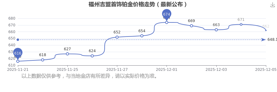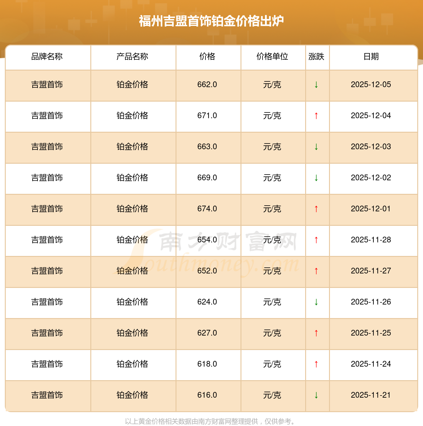 662.0元/克的铂金价格,是福州吉盟首饰在 2025年12月7日给出的。