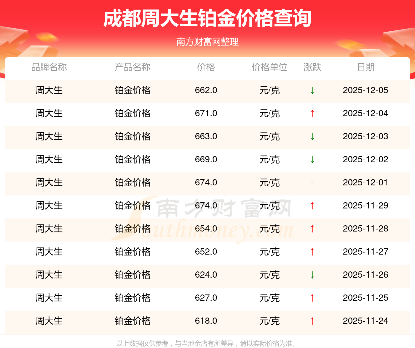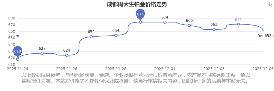 今日(2025年12月7日),662.0元/克是成都周大生铂金价格的价格标准。