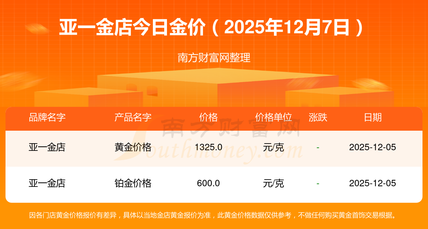 2025年12月7日亚一金店最新价格:黄金价格1328.0元/克,铂金价格662.0元/克,饰品金价(内地)1328.0元/克,黄金饰品(香港)46550.0,铂金价格(香港)18970.0,金条价格(香港)41990.0,金条金价(内地)1165.0元/克,黄金价格1325.0元/克,铂金价格600.0元/克,足金价格1325.0元/克,黄金价格1289.0元/克。