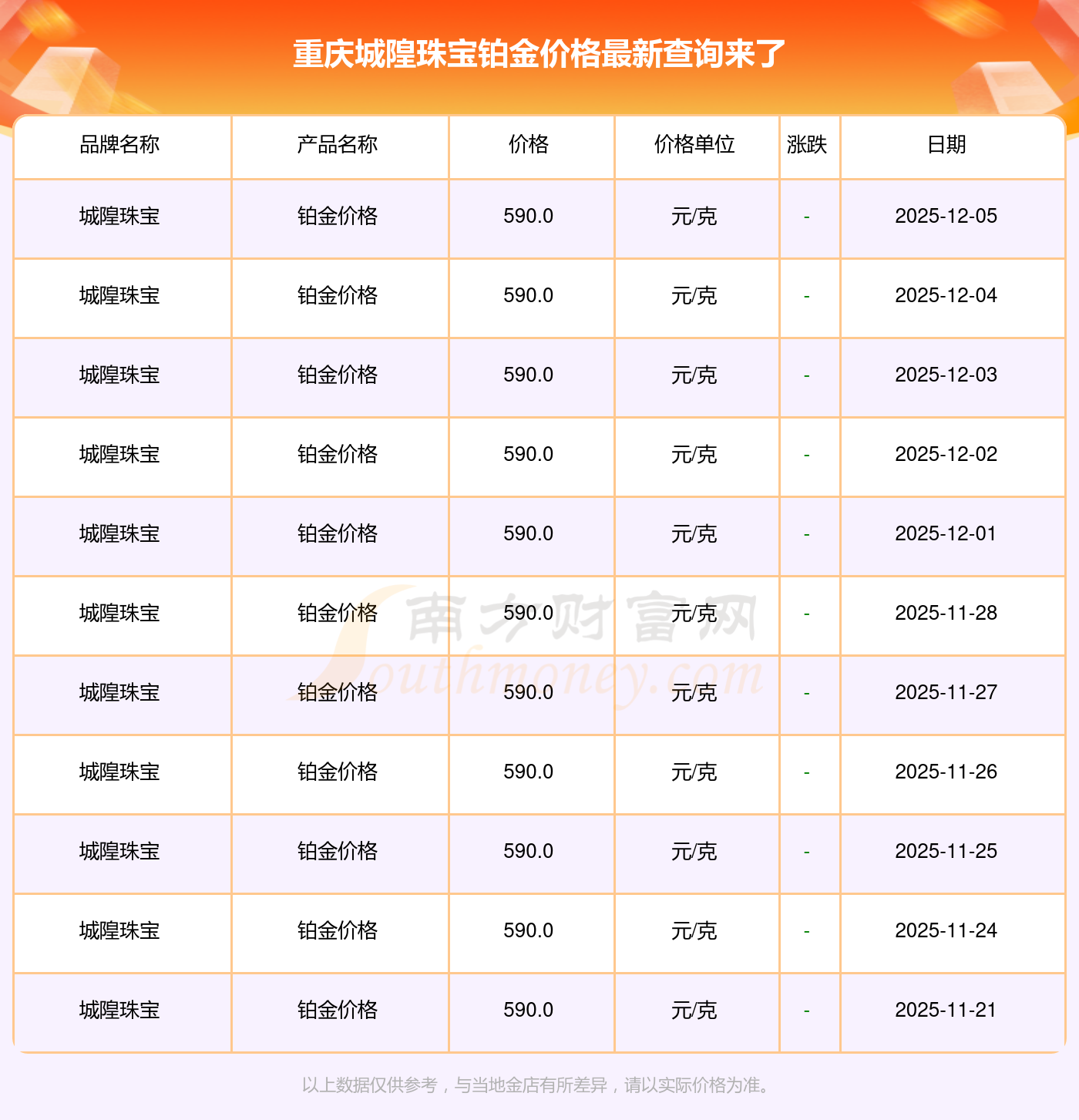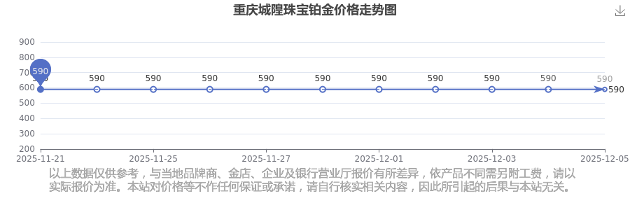 2025年12月7日当天,重庆城隍珠宝铂金价格的单价是 590.0元/克。