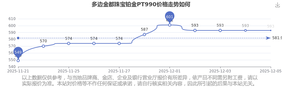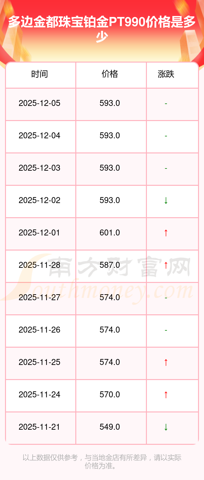 今日多边金都珠宝铂金PT990最新价格为593.0元/克。
