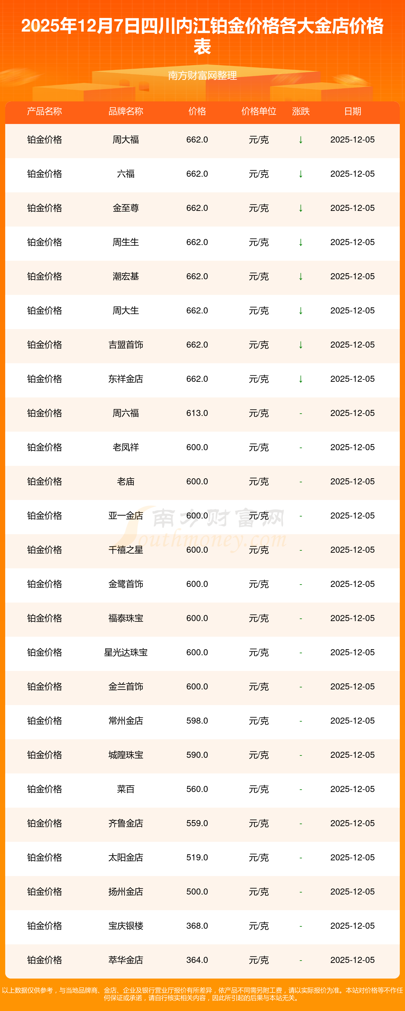 2025年12月7日四川内江周大福、周大福、周大福、周大福、周大福、周大福、周大福、老凤祥、老凤祥、老凤祥、周六福等各大金店品牌铂金价格最新价格行情来了,如下:周大福黄金价格1328.0元/克,周大福铂金价格662.0元/克,周大福饰品金价(内地)1328.0元/克,周大福黄金饰品(香港)46550.0,周大福铂金价格(香港)18970.0,周大福金条价格(香港)41990.0,周大福金条金价(内地)1165.0元/克,老凤祥黄金价格1325.0元/克,老凤祥铂金价格600.0元/克,老凤祥足金价格1325.0元/克,周六福黄金价格1289.0元/克。