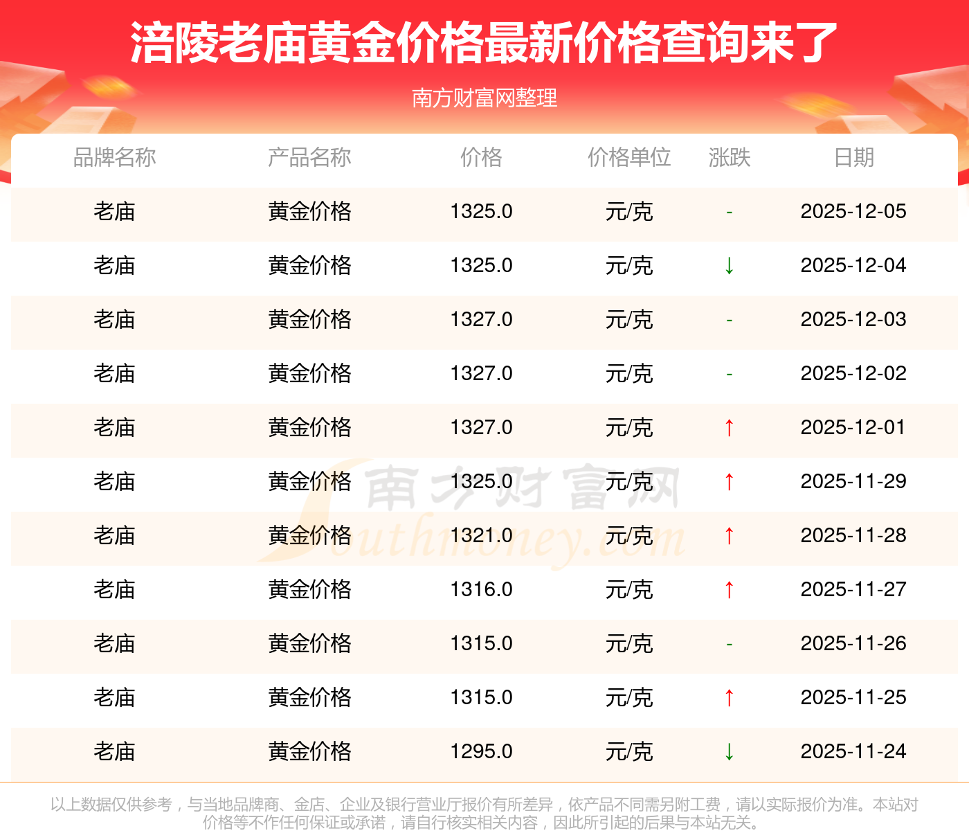 今日(2025年12月7日),涪陵老庙黄金价格的价格是1325.0元/克。