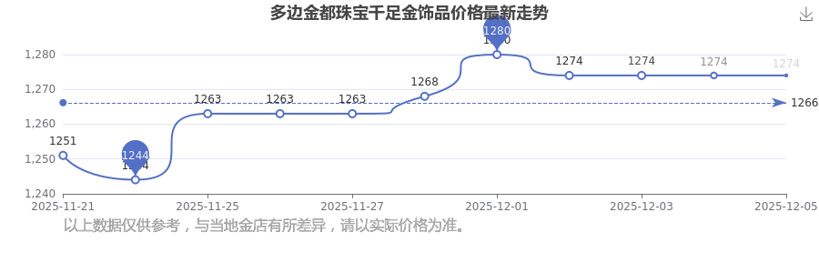 据了解,多边金都珠宝今日千足金饰品价格为1274.0元/克。