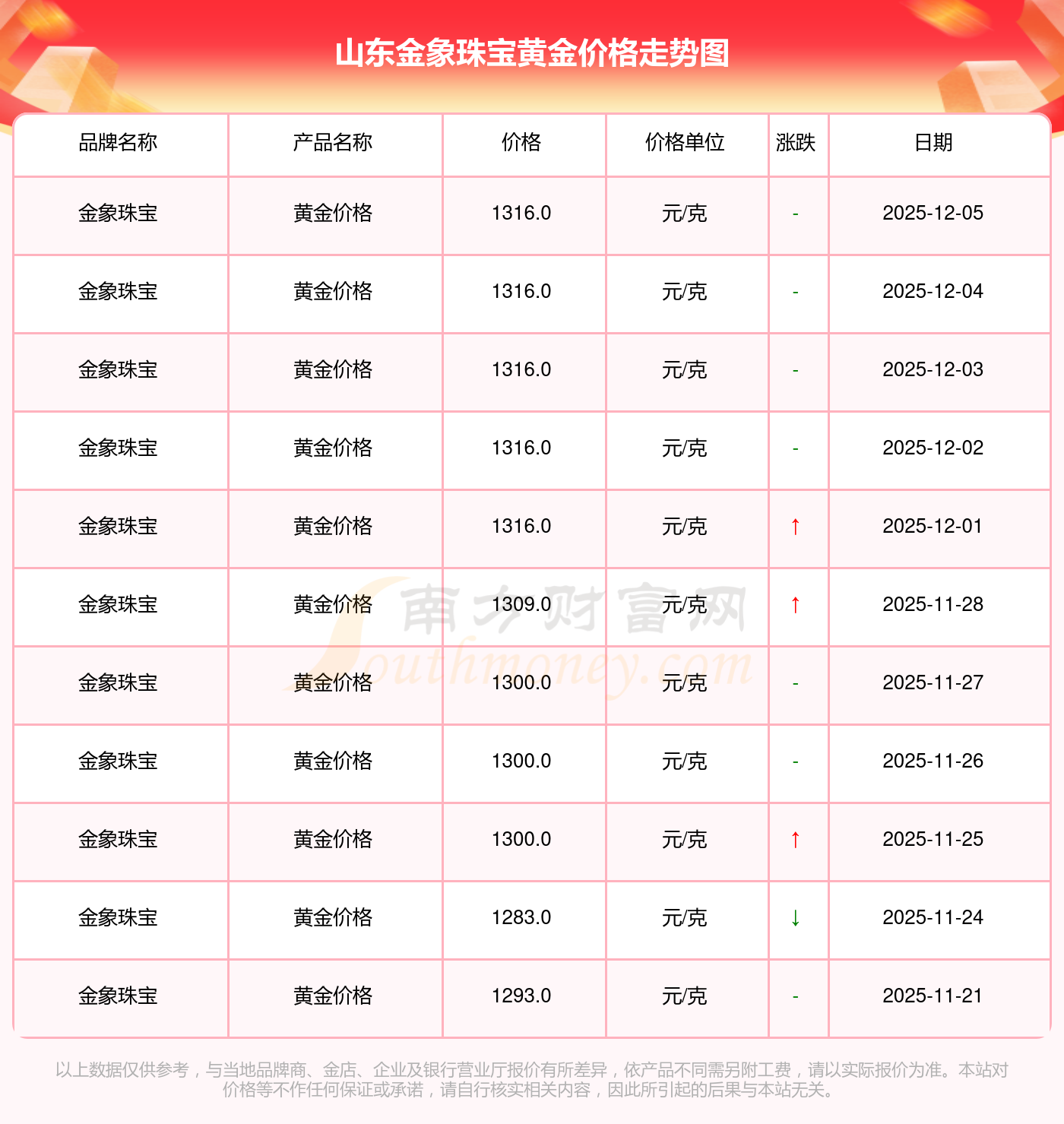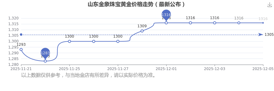 今日山东金象珠宝黄金价格是1316.0元/克。