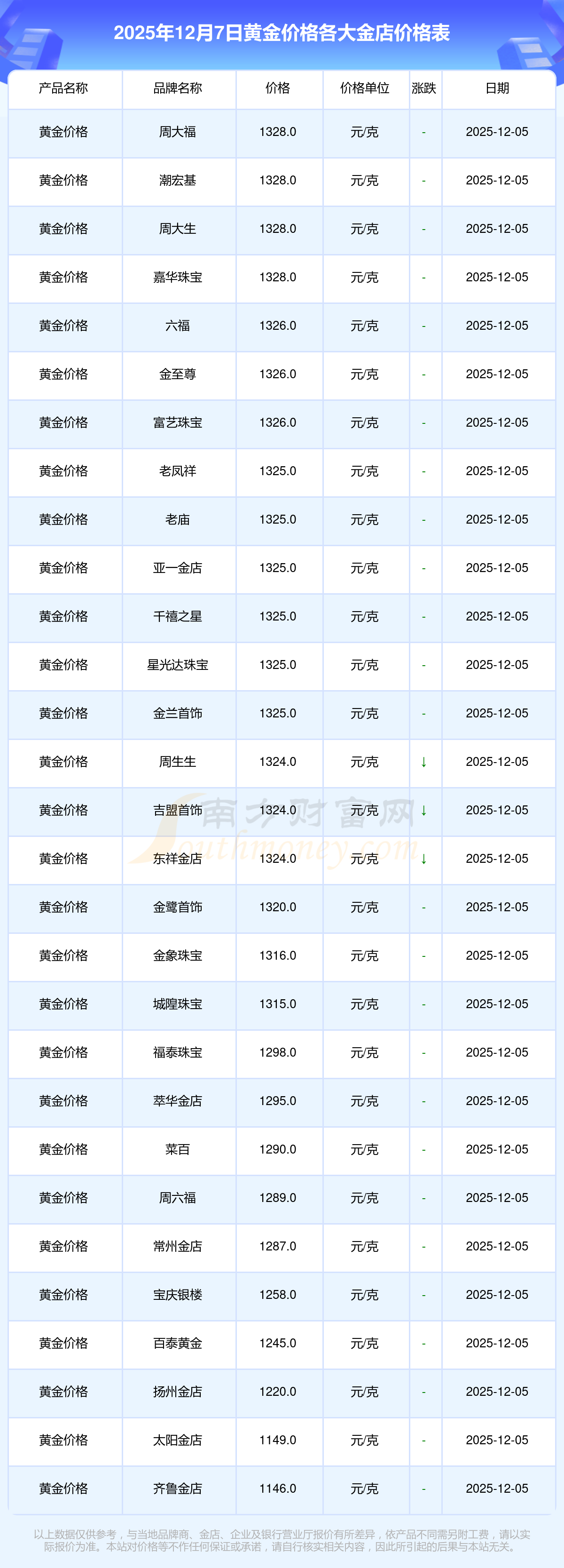 以上数据仅供参考,与当地品牌商、金店、企业及银行营业厅报价有所差异,依产品不同需另附工费,请以实际报价为准。本站对价格等不作任何保证或承诺,请自行核实相关内容,因此所引起的后果与本站无关。