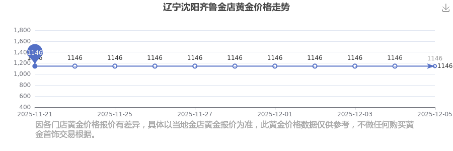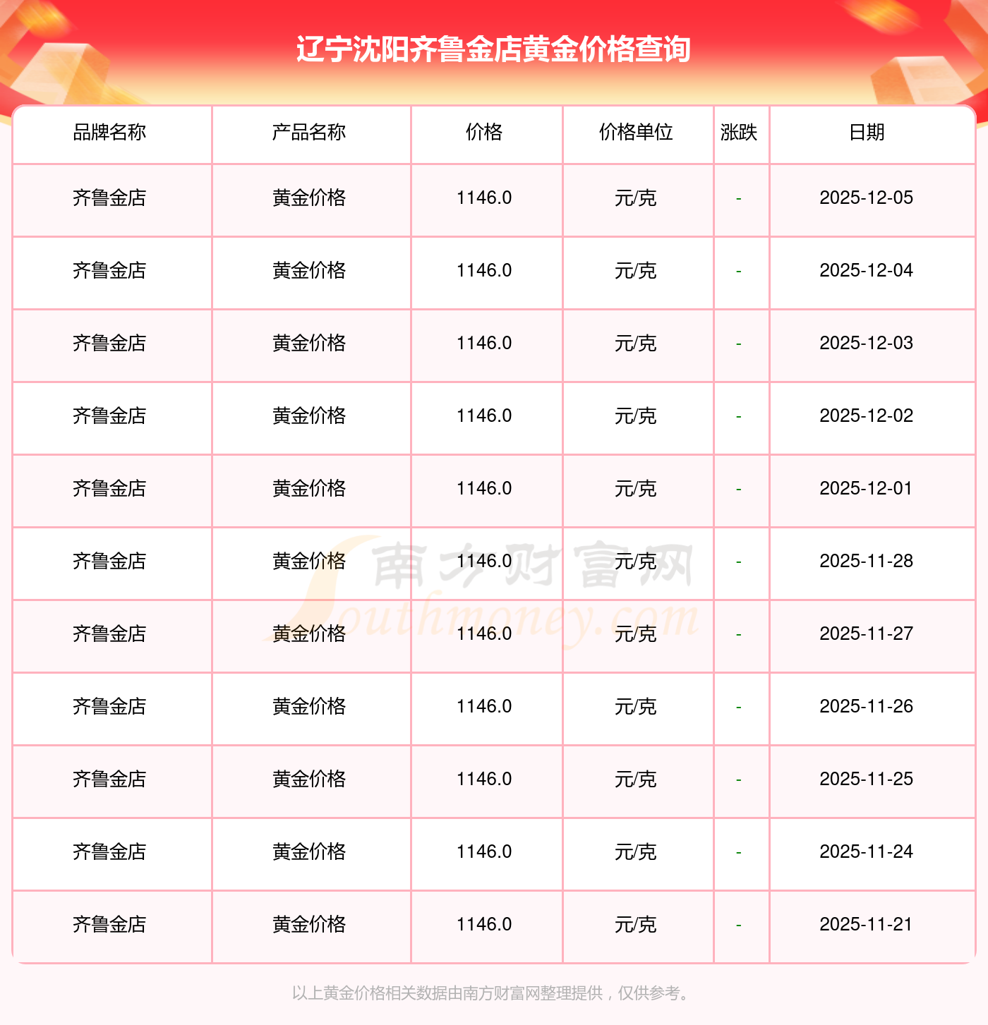 今日(2025年12月7日),辽宁沈阳齐鲁金店黄金价格每克的价值为1146.0元/克。