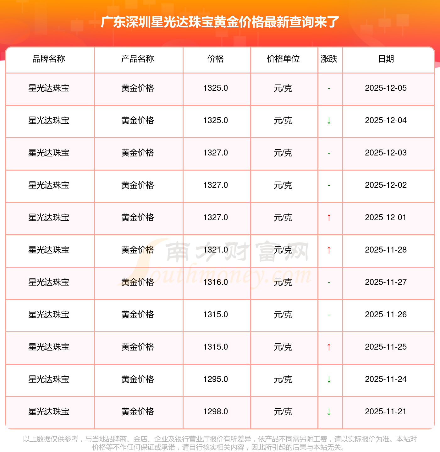 于 2025年12月7日,广东深圳星光达珠宝黄金价格的克价为1325.0元/克。