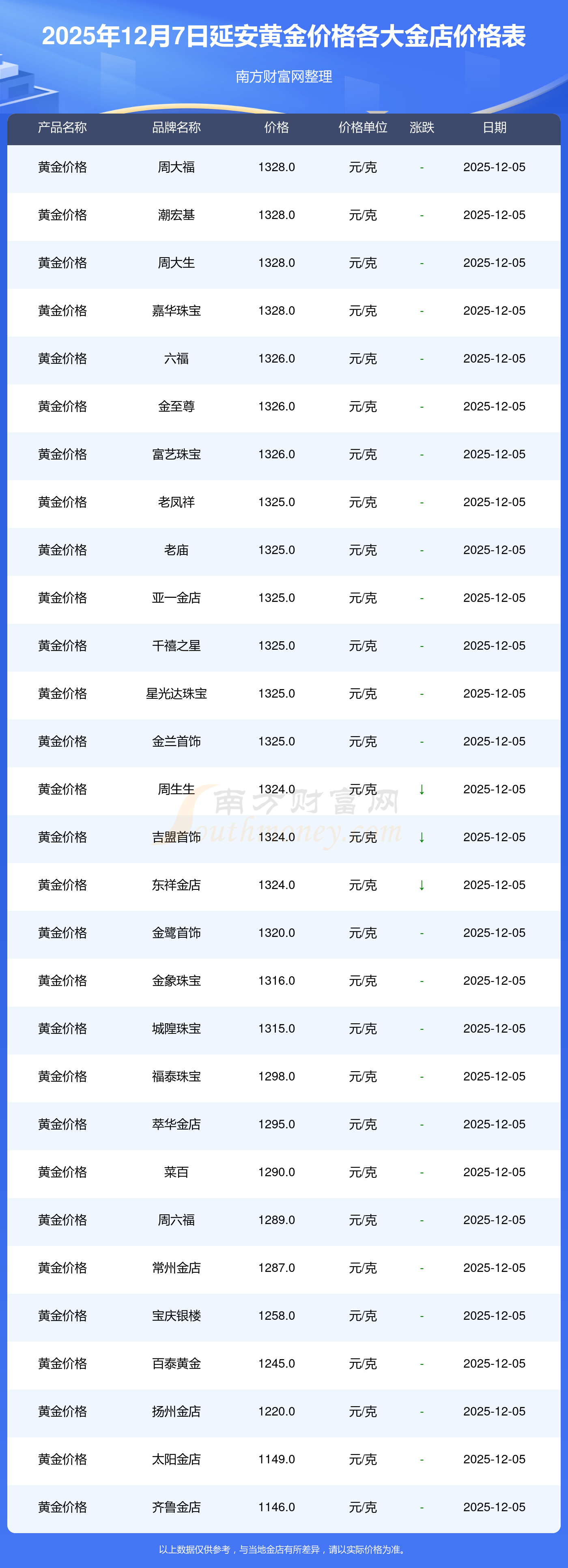 2025年12月7日延安各大金店黄金价格最新价格:周大福1328.0元/克,周大福662.0元/克,周大福1328.0元/克,周大福46550.0,周大福18970.0,周大福41990.0,周大福1165.0元/克,老凤祥1325.0元/克,老凤祥600.0元/克,老凤祥1325.0元/克,周六福1289.0元/克。