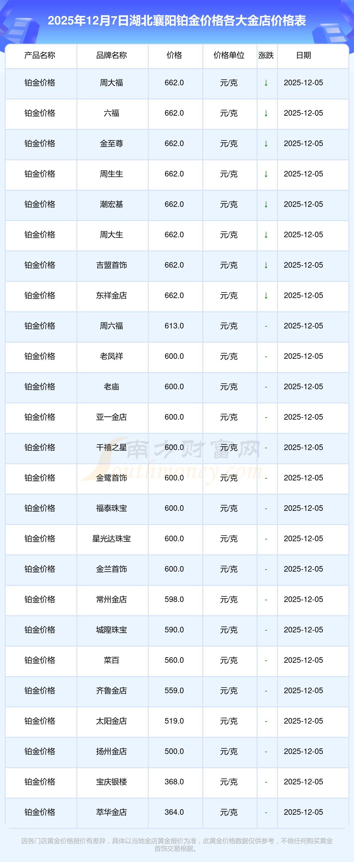 2025年12月7日,湖北襄阳周大福、周大福、周大福、周大福、周大福、周大福、周大福、老凤祥、老凤祥、老凤祥、周六福等各大金店品牌铂金价格今日价格如下:周大福1328.0元/克、周大福662.0元/克、周大福1328.0元/克、周大福46550.0、周大福18970.0、周大福41990.0、周大福1165.0元/克、老凤祥1325.0元/克、老凤祥600.0元/克、老凤祥1325.0元/克、周六福1289.0元/克。