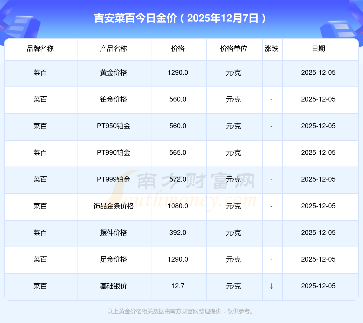 今天黄金价格行情怎样?此刻每克黄金售价多少?2025年12月7日吉安菜百每克黄金的市场价格是多少:黄金价格1328.0元/克,铂金价格662.0元/克,饰品金价(内地)1328.0元/克,黄金饰品(香港)46550.0,铂金价格(香港)18970.0,金条价格(香港)41990.0,金条金价(内地)1165.0元/克,黄金价格1325.0元/克,铂金价格600.0元/克,足金价格1325.0元/克,黄金价格1289.0元/克。