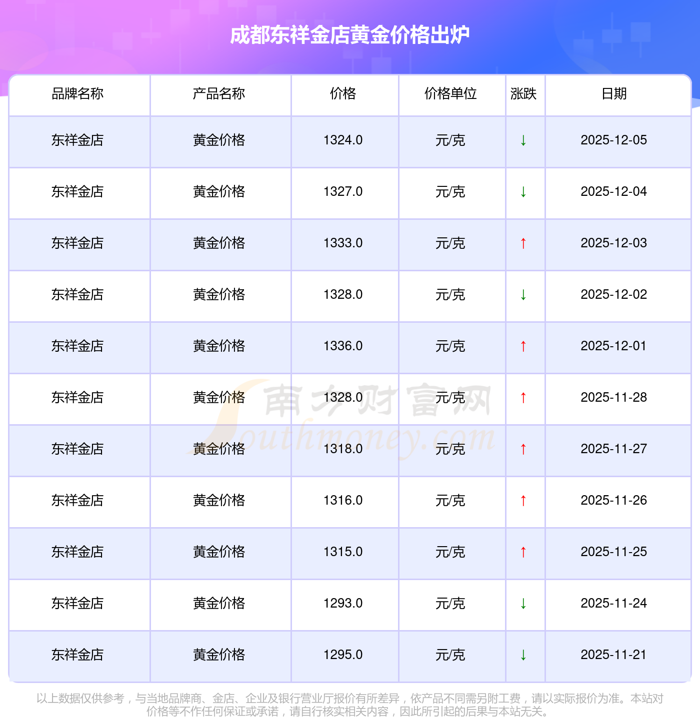 今日(2025年12月7日),成都东祥金店黄金价格的价格是1324.0元/克。