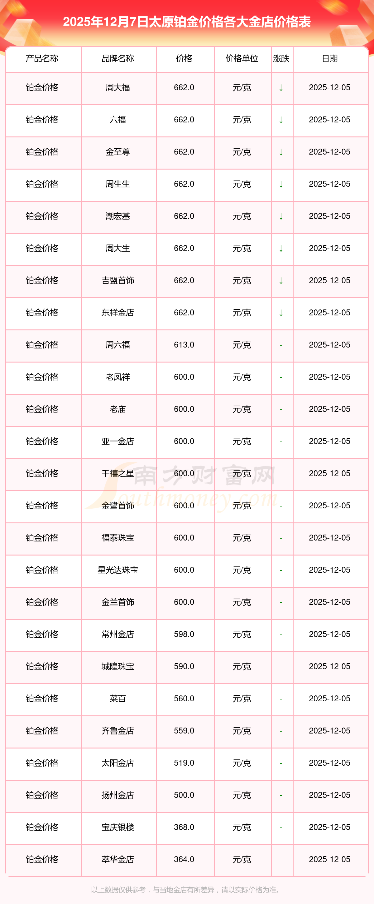 2025年12月7日太原周大福、周大福、周大福、周大福、周大福、周大福、周大福、老凤祥、老凤祥、老凤祥、周六福等各大金店品牌铂金价格最新价格行情来了,如下:周大福黄金价格1328.0元/克,周大福铂金价格662.0元/克,周大福饰品金价(内地)1328.0元/克,周大福黄金饰品(香港)46550.0,周大福铂金价格(香港)18970.0,周大福金条价格(香港)41990.0,周大福金条金价(内地)1165.0元/克,老凤祥黄金价格1325.0元/克,老凤祥铂金价格600.0元/克,老凤祥足金价格1325.0元/克,周六福黄金价格1289.0元/克。