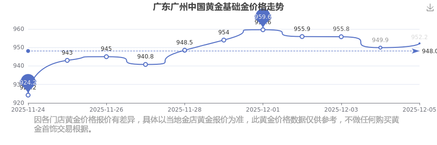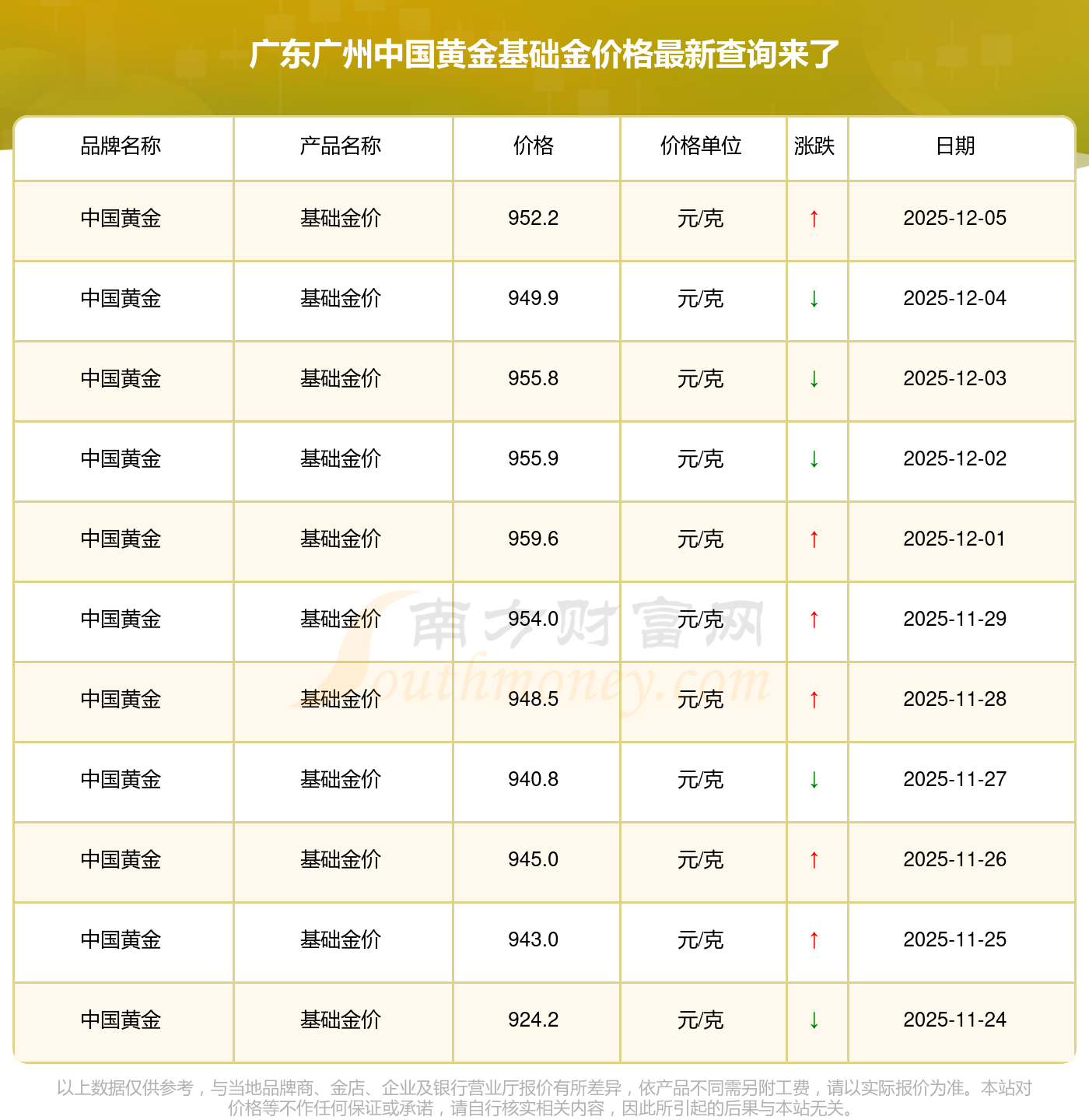 今日(2025年12月7日)广东广州中国黄金基础金价格为952.2元/克。