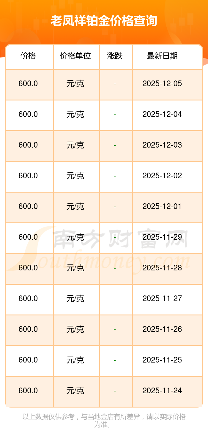 今日(2025年12月7日)老凤祥铂金价格的价格为600.0元/克。