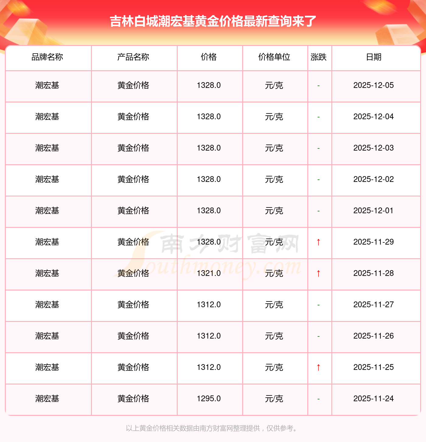 (2025年12月7日)吉林白城潮宏基黄金价格现在为1328.0元/克。