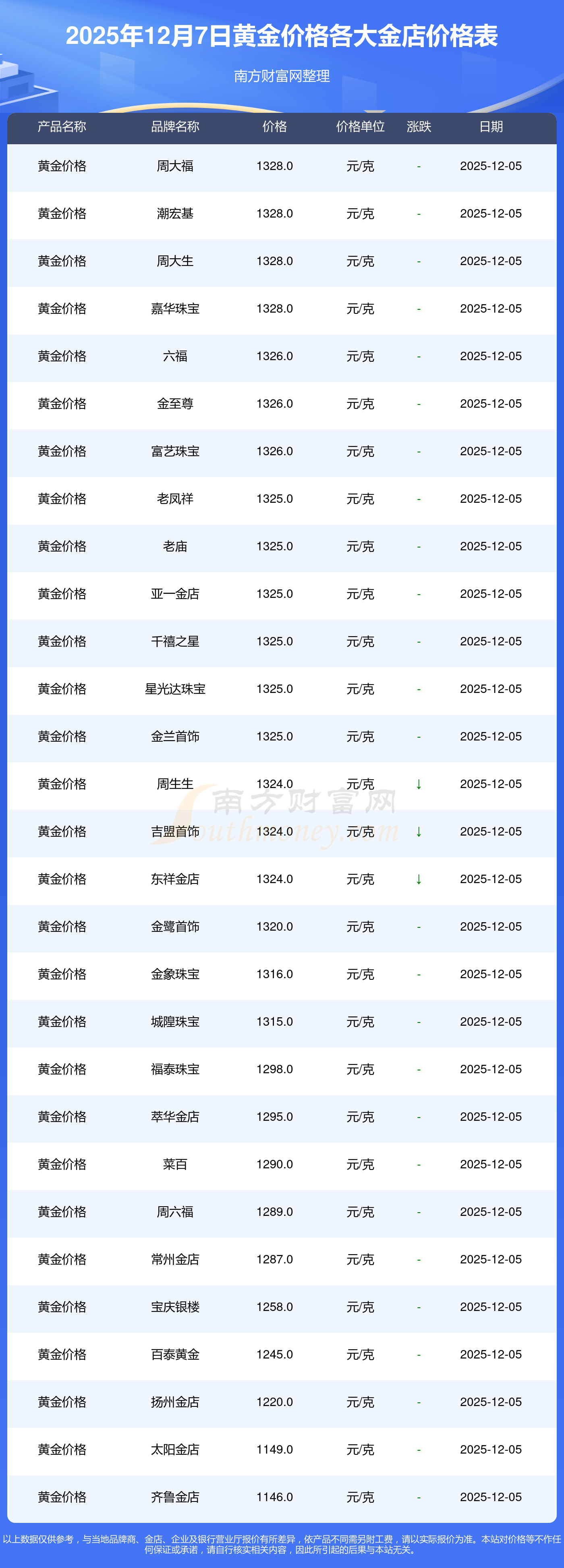 今天是2025年12月7日,周大福、周大福、周大福、周大福、周大福、周大福、周大福、老凤祥、老凤祥、老凤祥、周六福等各大金店品牌黄金价格最新价格如下:周大福1328.0元/克、周大福662.0元/克、周大福1328.0元/克、周大福46550.0、周大福18970.0、周大福41990.0、周大福1165.0元/克、老凤祥1325.0元/克、老凤祥600.0元/克、老凤祥1325.0元/克、周六福1289.0元/克。