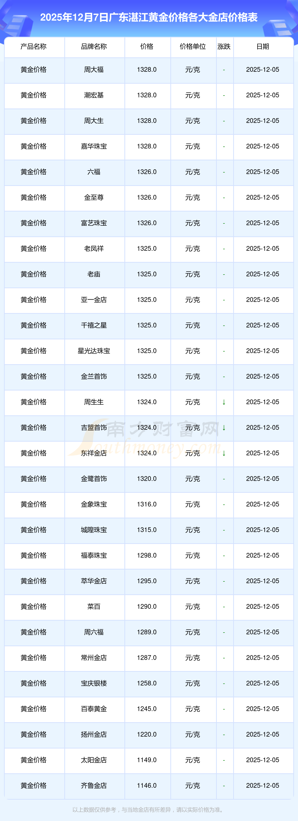 今天是2025年12月7日,广东湛江周大福、周大福、周大福、周大福、周大福、周大福、周大福、老凤祥、老凤祥、老凤祥、周六福等各大金店品牌黄金价格最新价格如下:周大福1328.0元/克、周大福662.0元/克、周大福1328.0元/克、周大福46550.0、周大福18970.0、周大福41990.0、周大福1165.0元/克、老凤祥1325.0元/克、老凤祥600.0元/克、老凤祥1325.0元/克、周六福1289.0元/克。