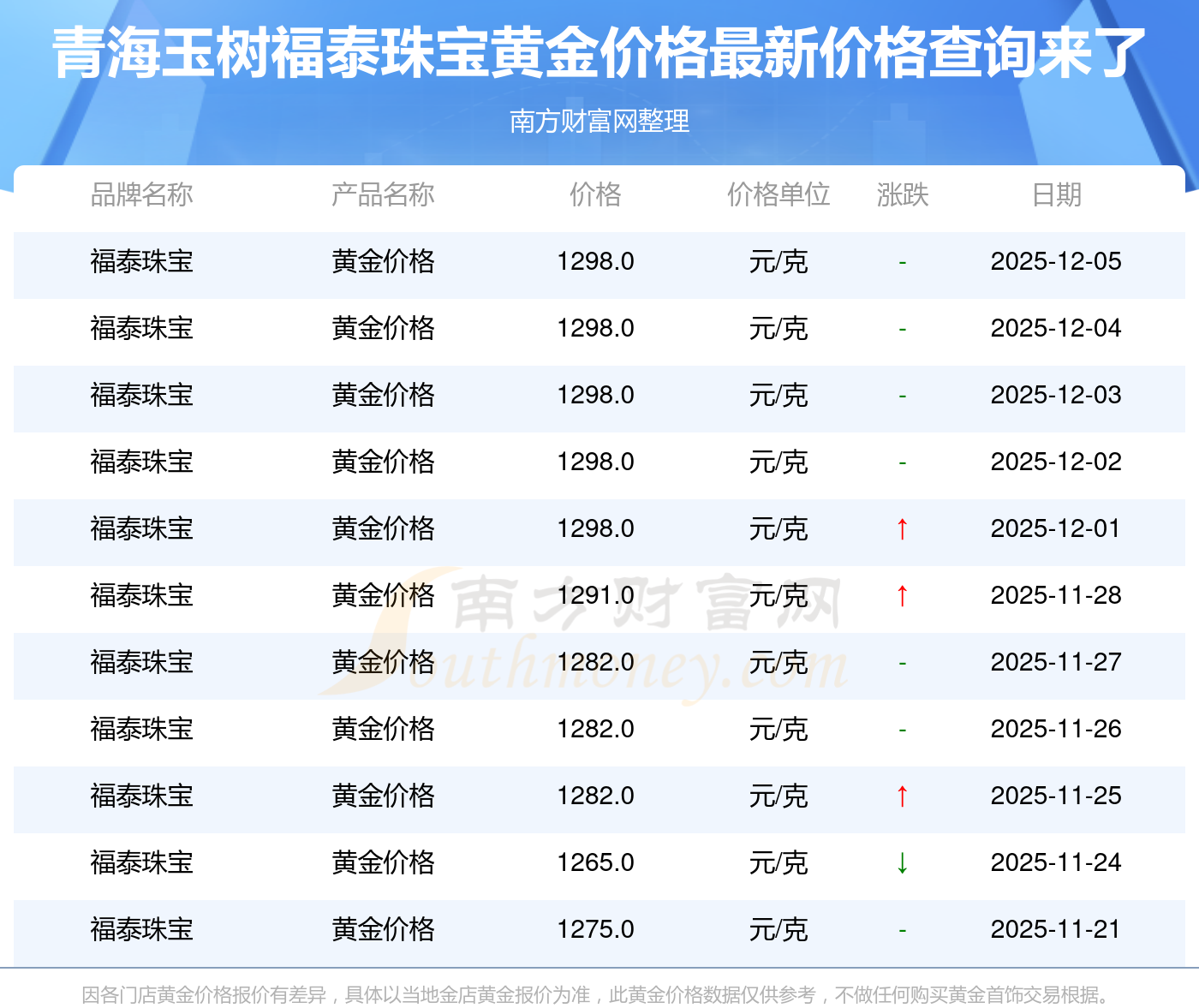 今日(2025年12月7日),青海玉树福泰珠宝黄金价格的定价为 1298.0元/克。
