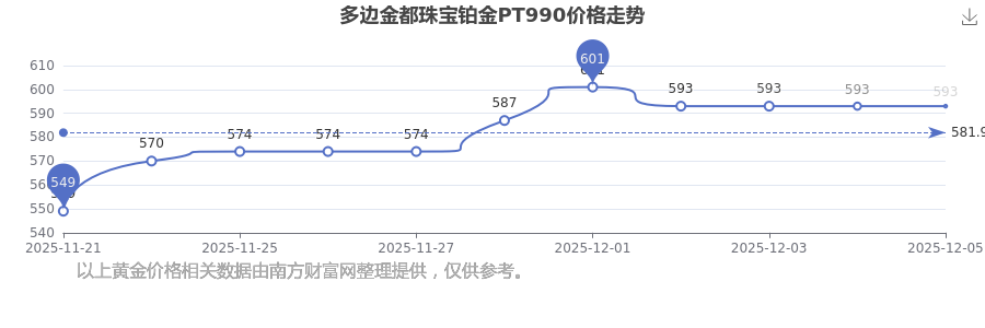今日(2025年12月7日),多边金都珠宝铂金PT990最新价格为593.0元/克。