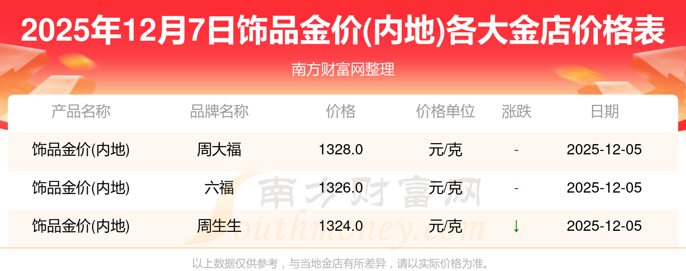 今天是2025年12月7日,周大福、周大福、周大福、周大福、周大福、周大福、周大福、老凤祥、老凤祥、老凤祥、周六福等各大金店品牌饰品金价(内地)最新价格如下:周大福1328.0元/克、周大福662.0元/克、周大福1328.0元/克、周大福46550.0、周大福18970.0、周大福41990.0、周大福1165.0元/克、老凤祥1325.0元/克、老凤祥600.0元/克、老凤祥1325.0元/克、周六福1289.0元/克。
