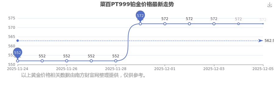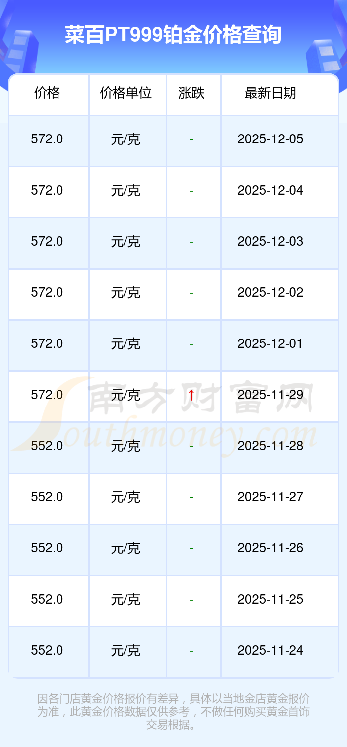 今日(2025年12月7日),菜百PT999铂金最新价格是572.0元/克。