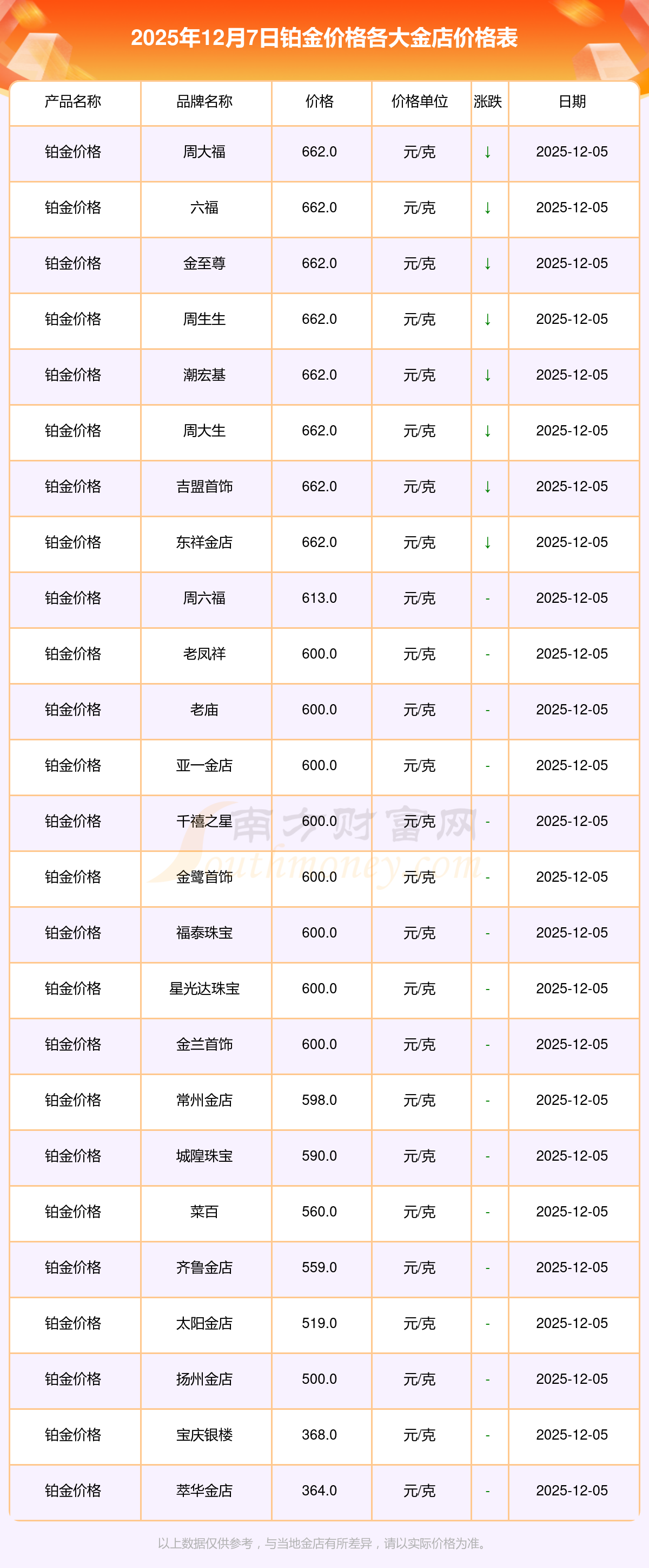 2025年12月7日各大金店铂金价格最新价格:周大福1328.0元/克,周大福662.0元/克,周大福1328.0元/克,周大福46550.0,周大福18970.0,周大福41990.0,周大福1165.0元/克,老凤祥1325.0元/克,老凤祥600.0元/克,老凤祥1325.0元/克,周六福1289.0元/克。