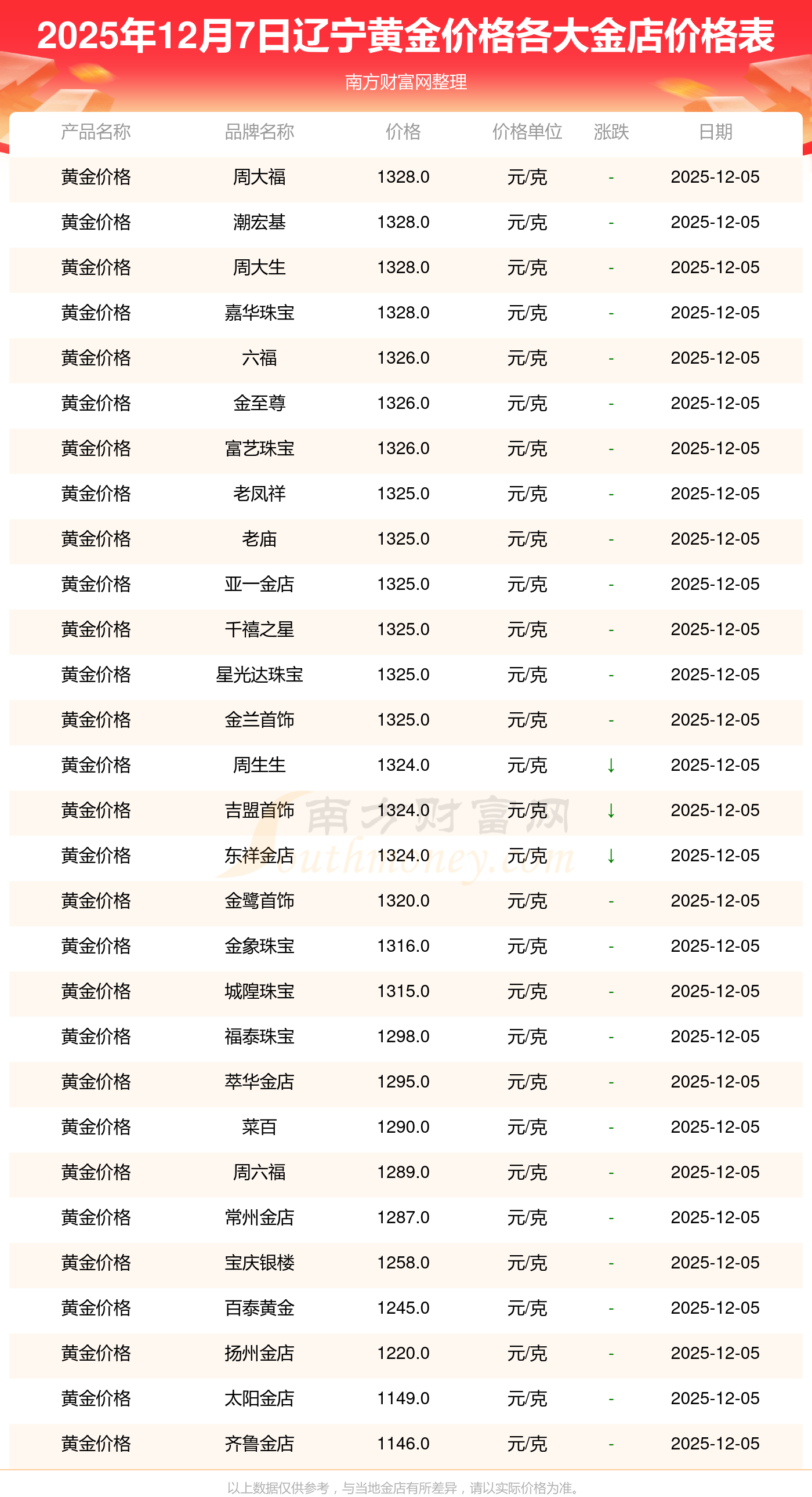 2025年12月7日,辽宁周大福、周大福、周大福、周大福、周大福、周大福、周大福、老凤祥、老凤祥、老凤祥、周六福等各大金店品牌黄金价格今日价格行情最新来了:周大福1328.0元/克、周大福662.0元/克、周大福1328.0元/克、周大福46550.0、周大福18970.0、周大福41990.0、周大福1165.0元/克、老凤祥1325.0元/克、老凤祥600.0元/克、老凤祥1325.0元/克、周六福1289.0元/克。